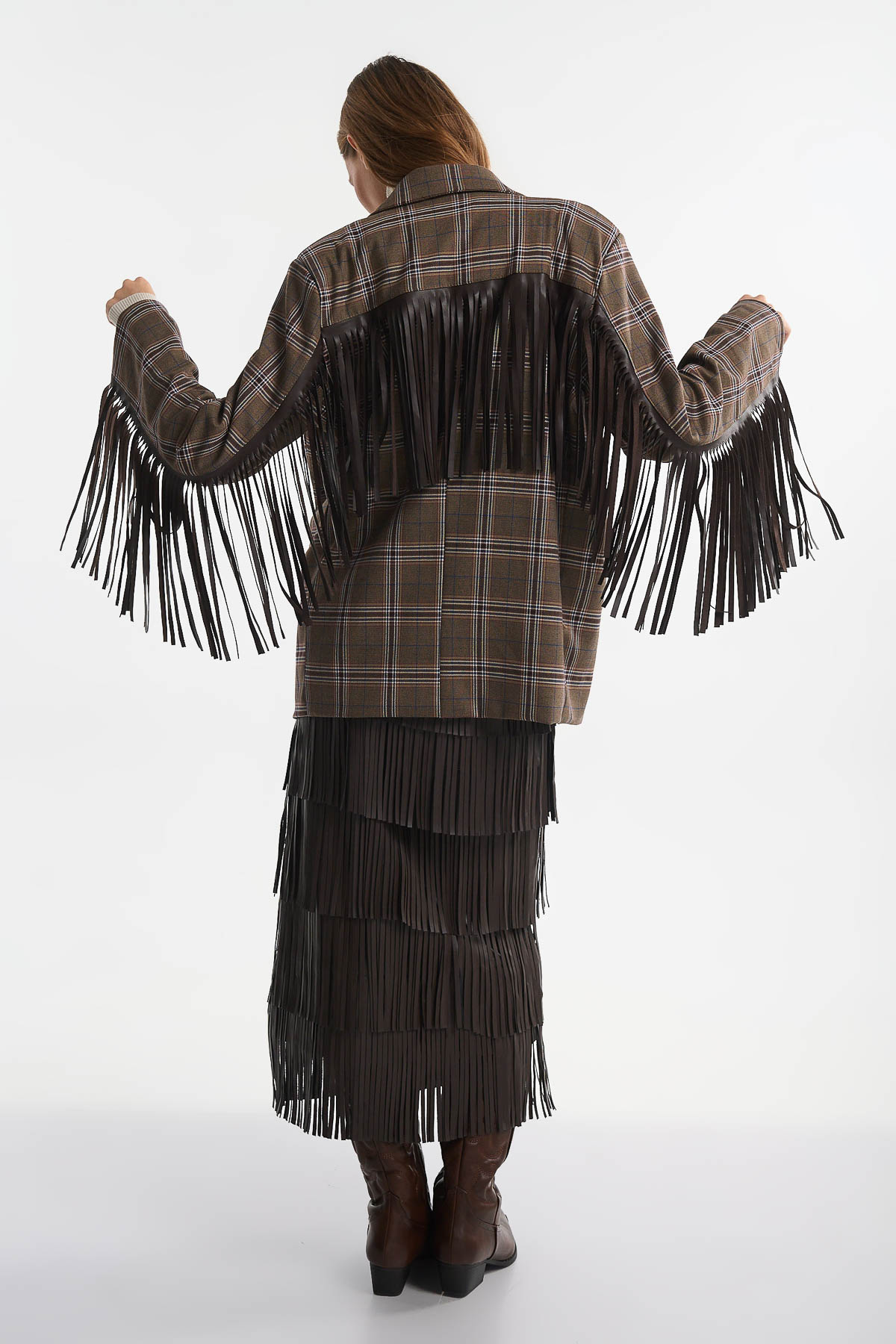 Αναδείξτε το στυλ σας με αυτό το εντυπωσιακό σακάκι σε καρό plaid μοτίβο, που ξεχωρίζει χάρη στα εντυπωσιακά δερμάτινα κρόσια στα μανίκια και την πλάτη. Με oversized γραμμή και κλασικό γιακά, συνδυάζει την κομψότητα με το western στοιχείο, προσφέροντας μια μοντέρνα αλλά ταυτόχρονα διαχρονική επιλογή. Ιδανικό για layering πάνω από πουκάμισα ή πλεκτά, φοριέται από το πρωί έως το βράδυ για μοναδικές εμφανίσεις. Διαθέτει εσωτερική επένδυση φόδρας , κλείνει με κουμπί μπροστά . Μήκος : 75 cm . Σύνθεση : 64% Polyester – 34% Viscose – 2% Elasthan.