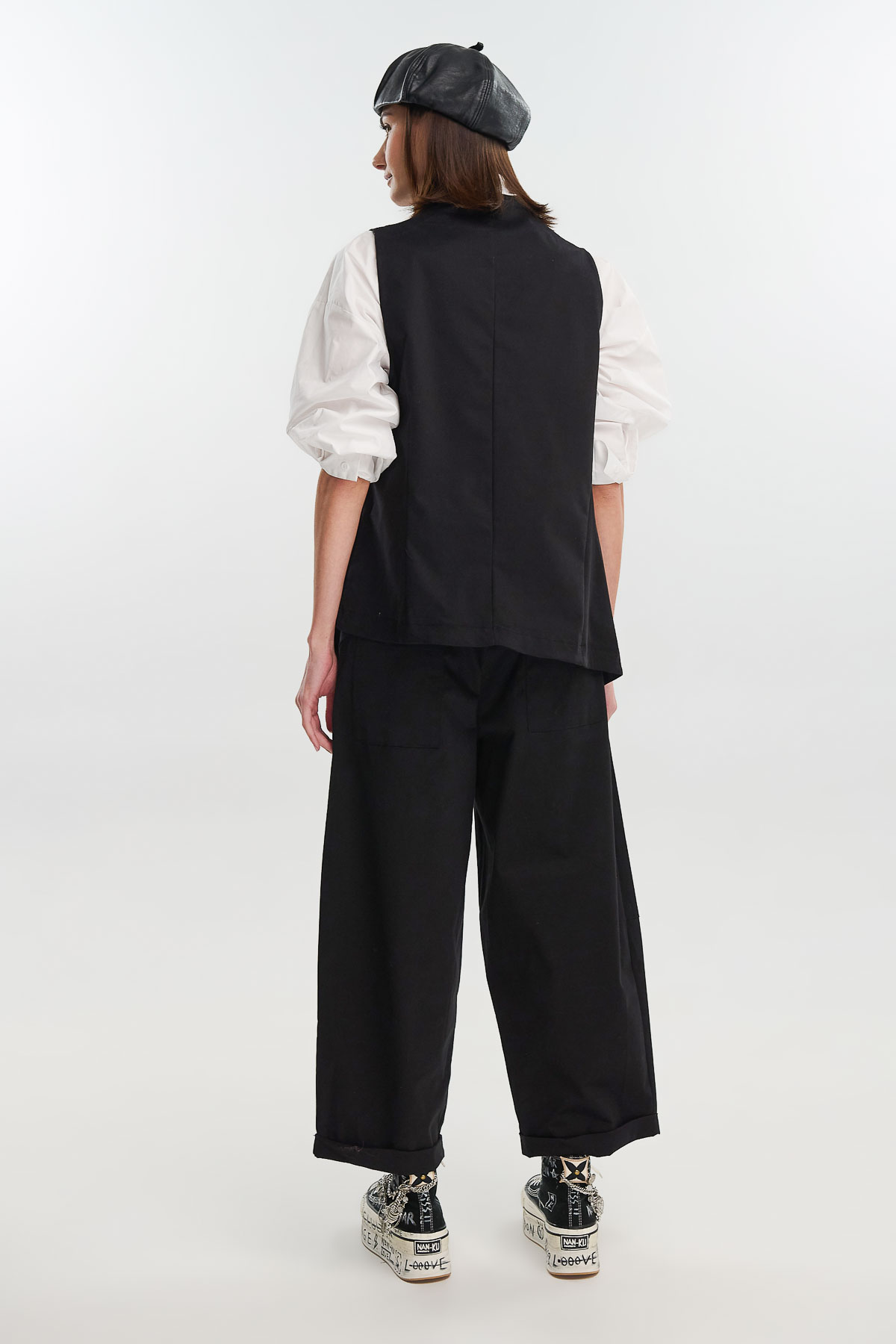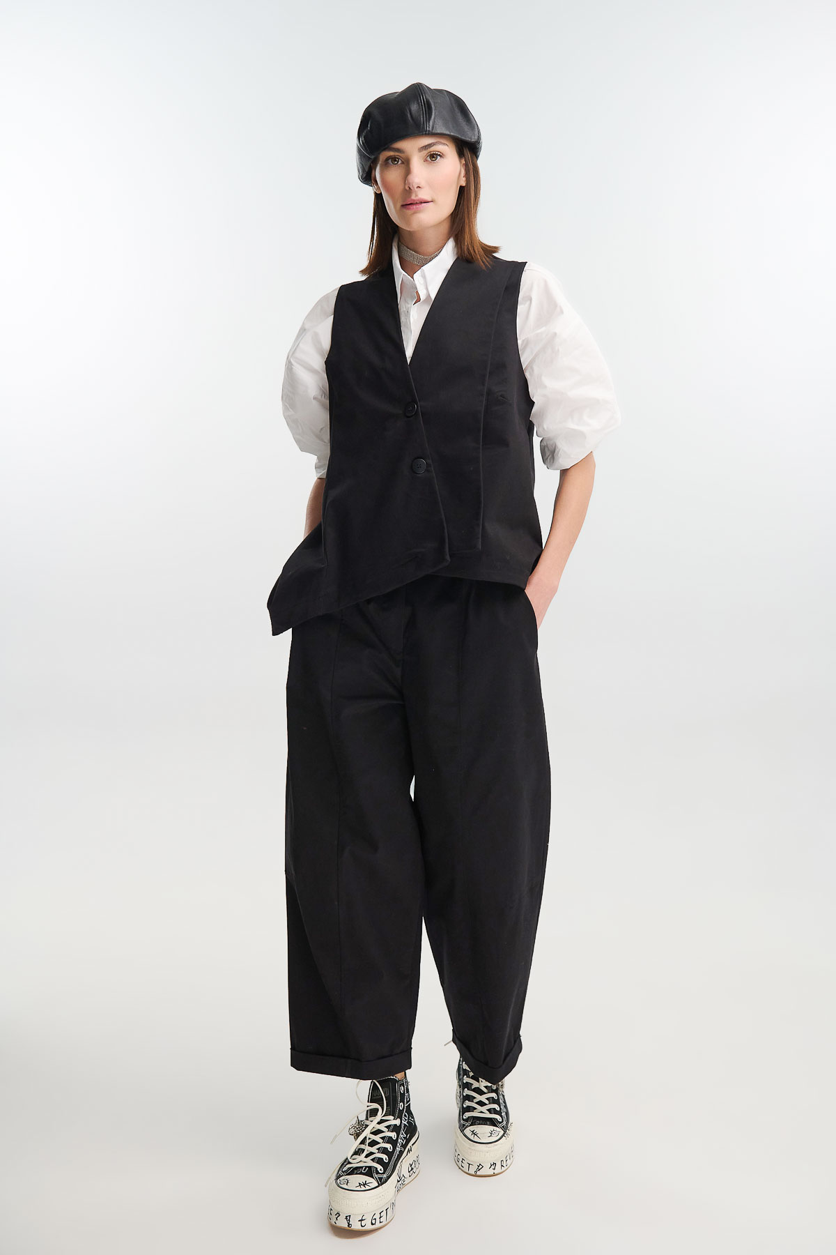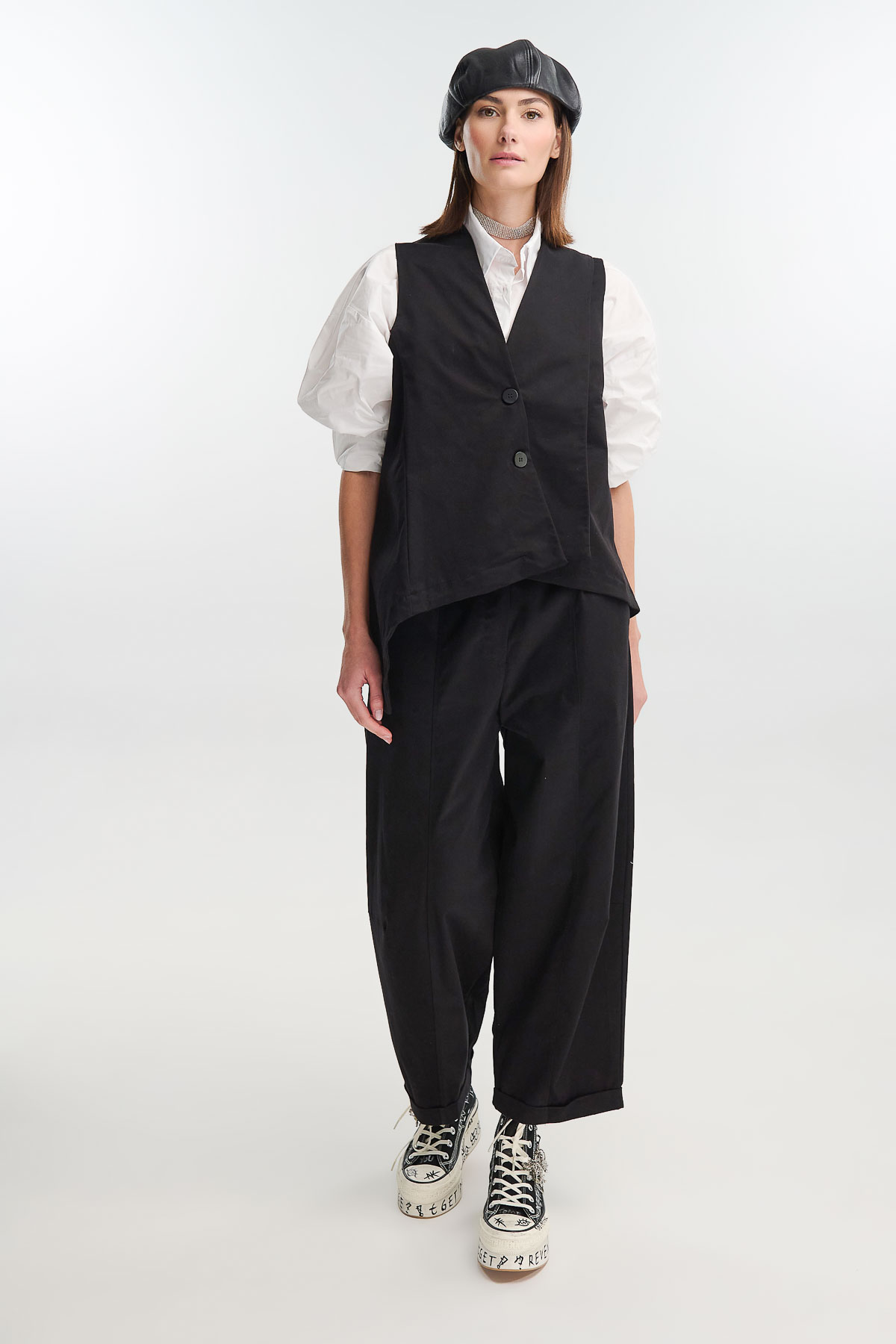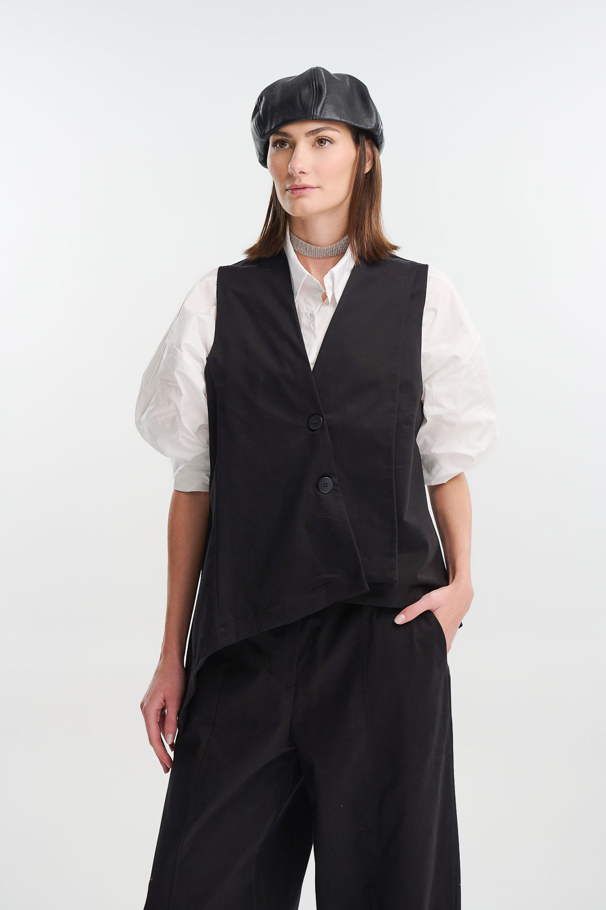 Ασύμμετρο γιλέκο από μαλακό suede ύφασμα, σε minimal γραμμή που προσφέρει μοντέρνα, ανδρόγυνη αισθητική. Διαθέτει σταυρωτό κλείσιμο με δύο κουμπιά και διακριτικές ραφές που αναδεικνύουν τη δομή του ρούχου. Η ασύμμετρη πατιλέτα χαρίζει δυναμική κίνηση και ξεχωριστό χαρακτήρα.