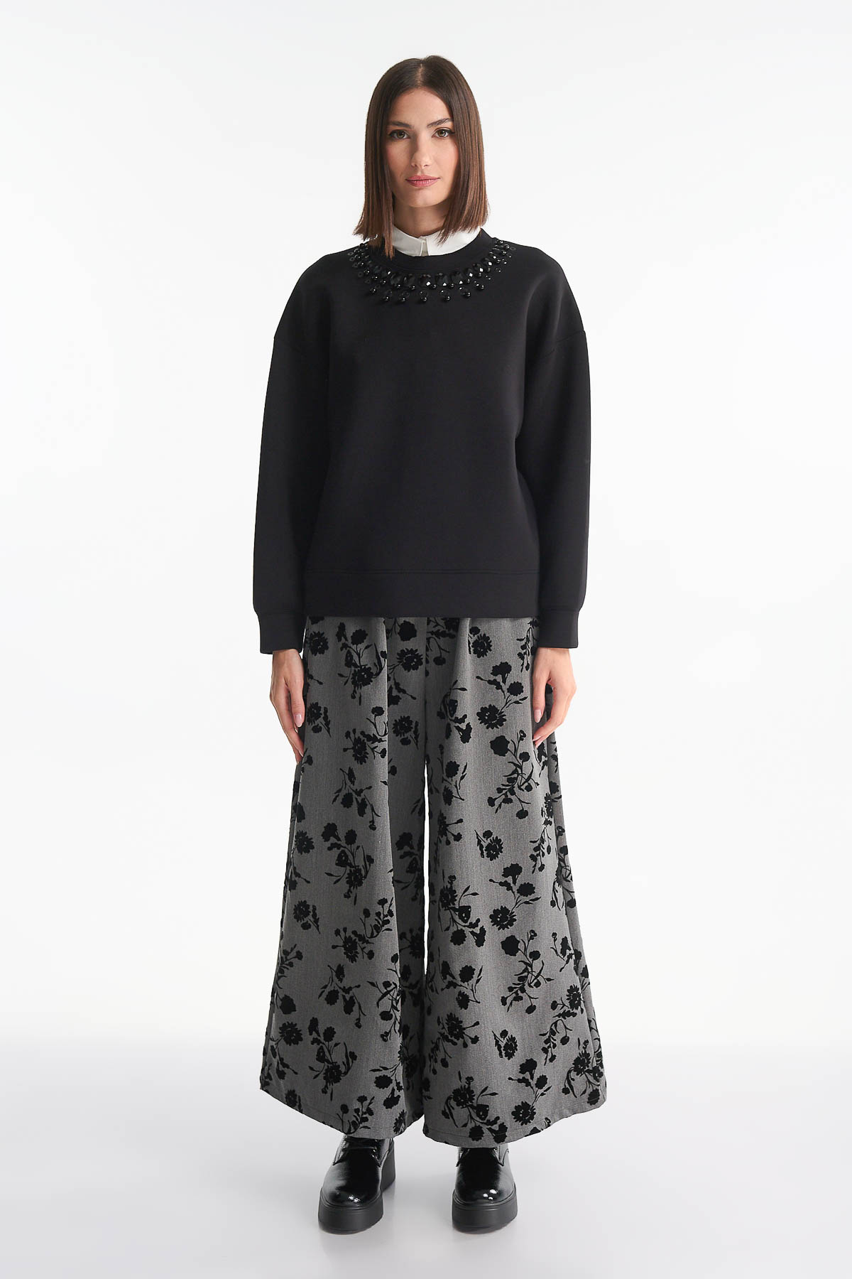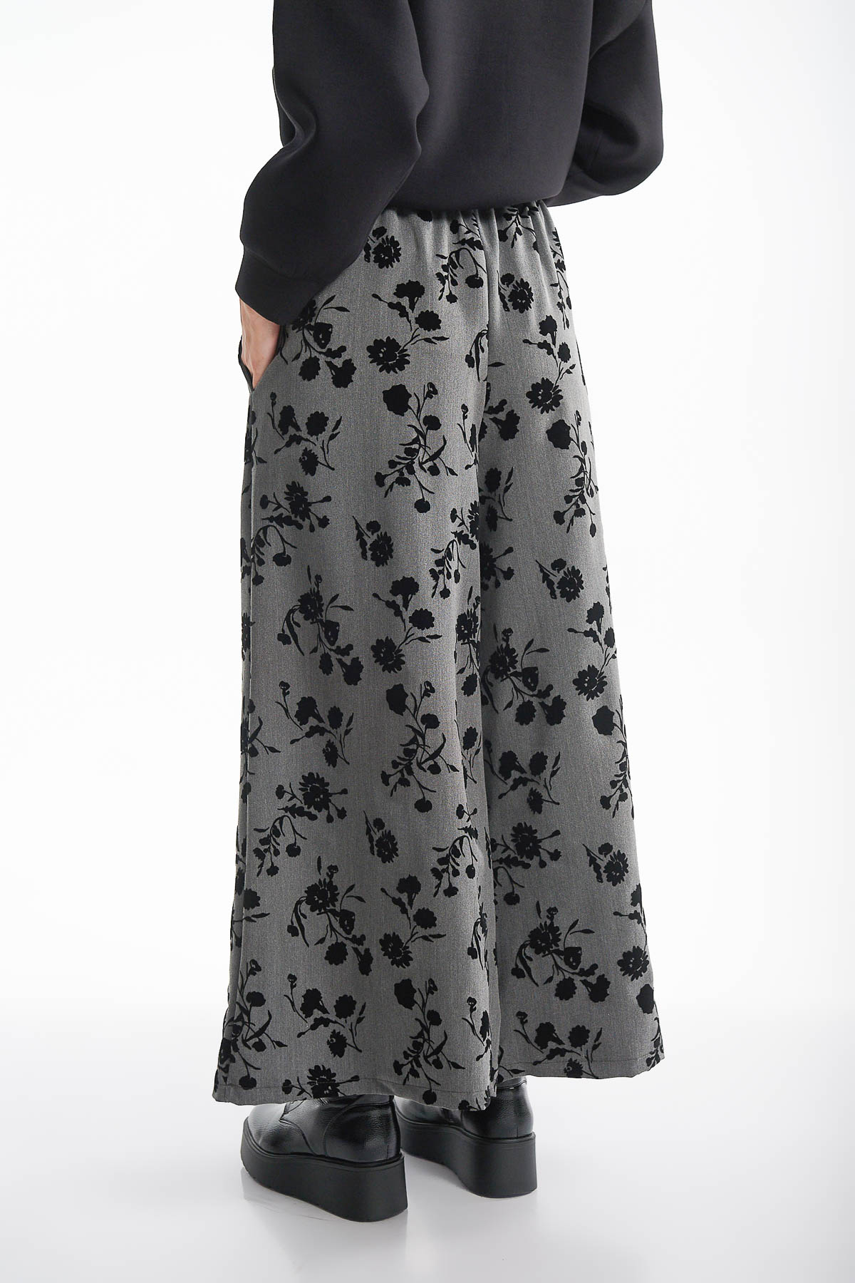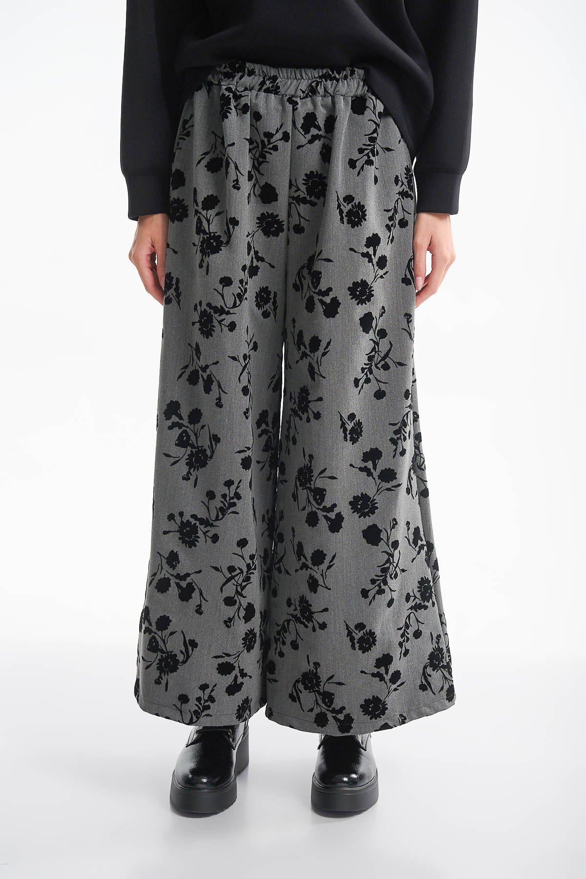 Η παντελόνα με απλικέ βελούδινες λεπτομέρειες σε μοτίβο λουλουδιών συνδυάζει την άνεση με την εκλεπτυσμένη θηλυκότητα. Το φαρδύ, αέρινο κόψιμο προσφέρει κομψή κίνηση, ενώ το γκρι ύφασμα λειτουργεί ως ιδανικό φόντο για τα μαύρα floral απλικέ που δίνουν βάθος και πολυτέλεια στο σχέδιο. Διαθέτει ελαστική μέση για άνετη εφαρμογή και μπορεί να φορεθεί τόσο σε casual εμφανίσεις με chunky boots, όσο και σε πιο επίσημες περιστάσεις με ψηλοτάκουνα. Διαθέτει πλαϊνές τσέπες . Καλύπτει απο XS έως XL . Σύνθεση : 79% Polyester – 18% Viscose – 3% Elasthan.