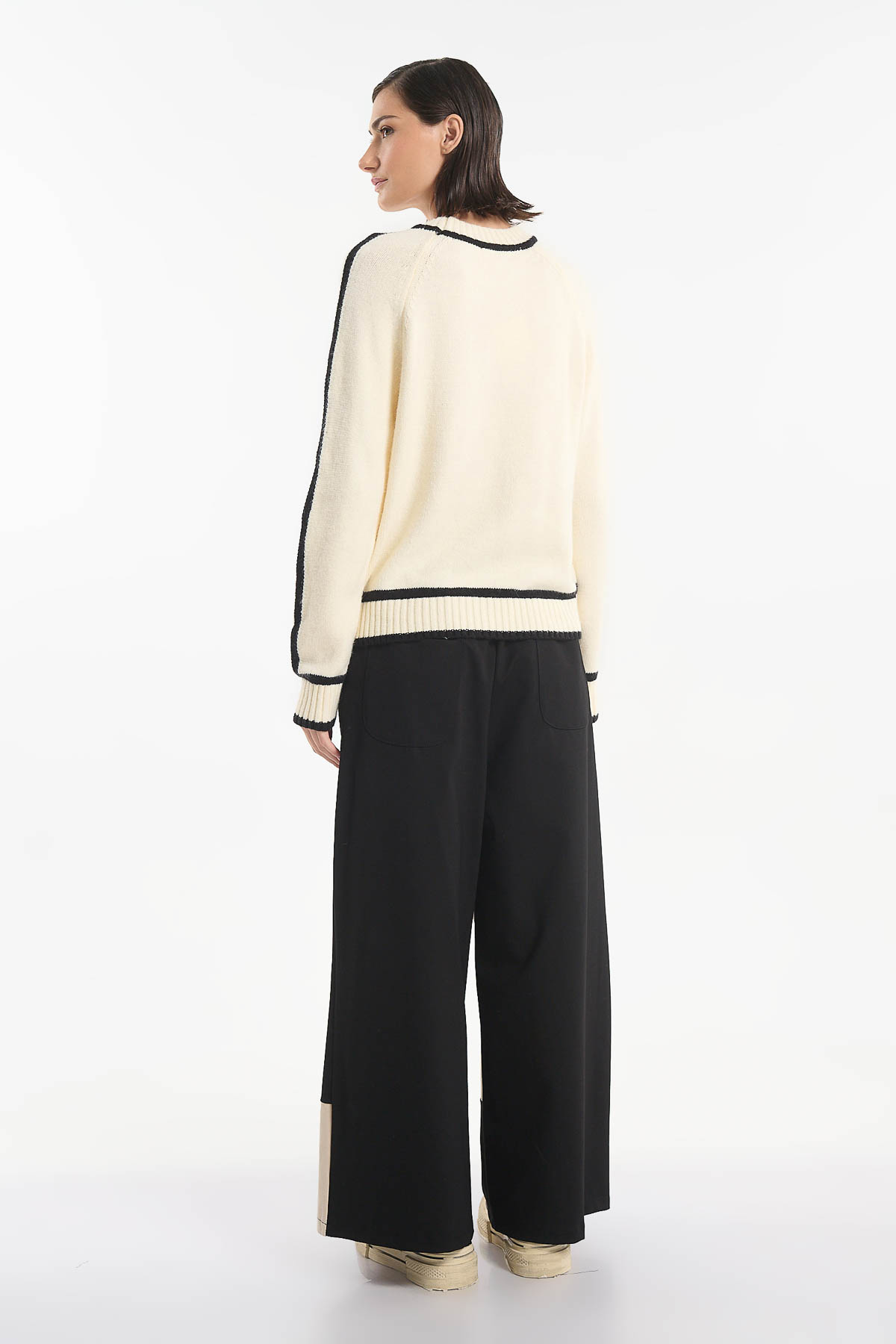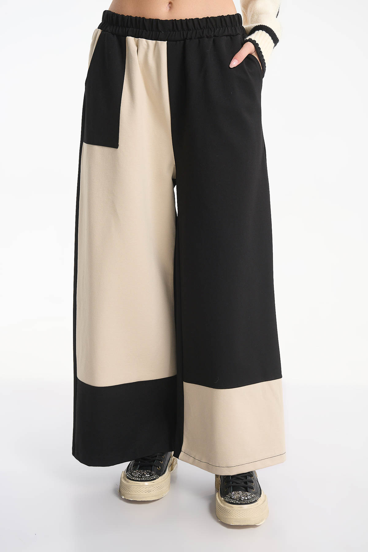 Παντελόνα δίχρωμη με λάστιχο στη μέση για άνετη εφαρμογή. Διαθέτει φαρδύ, ριχτό σχέδιο και ιδιαίτερο color block σε μαύρο και μπεζ. Μπροστινή τσέπη σε μοντέρνα ασύμμετρη γραμμή και δύο πρακτικές τσέπες στο πίσω μέρος. Ένα statement κομμάτι που συνδυάζει άνεση και στιλ, ιδανικό για εντυπωσιακές casual εμφανίσεις. Καλύπτει απο XS έως 2XL . Σύνθεση : 65% Viscose – 30% Polyamide – 5% Elasthan.