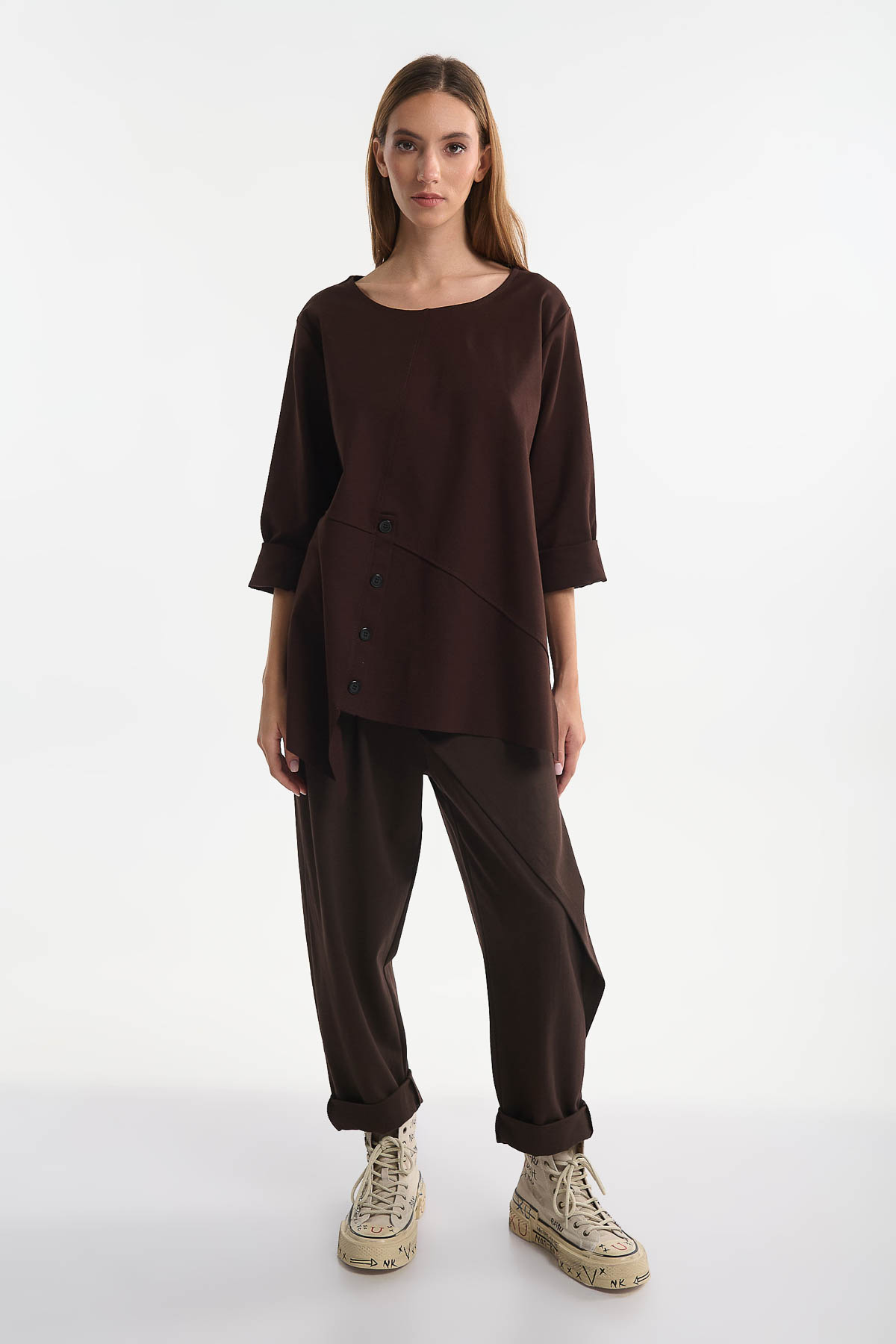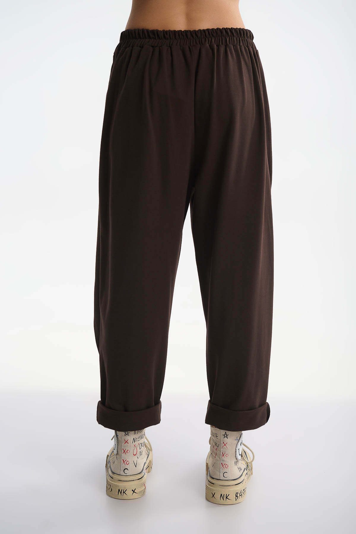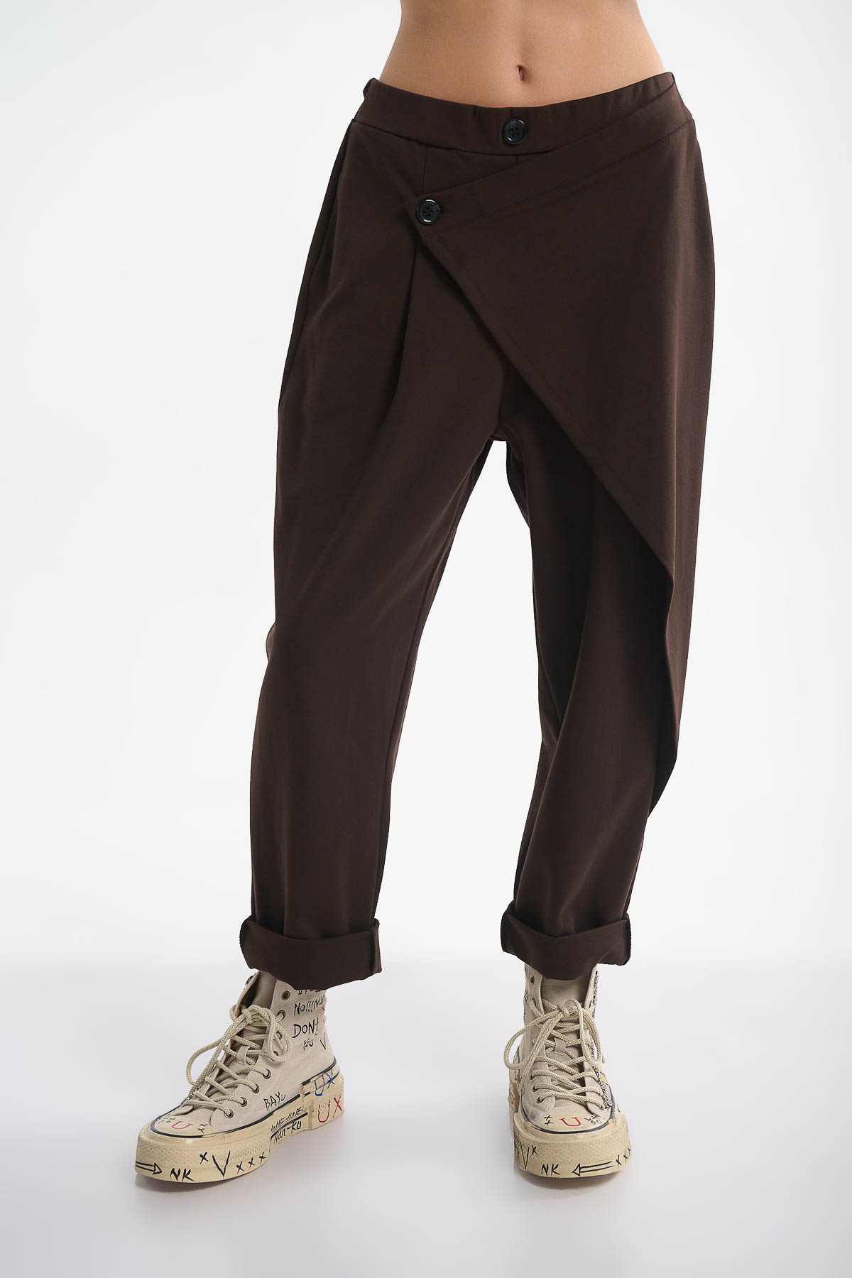Η παντελόνα φάκελος με λάστιχο επαναπροσδιορίζει το casual chic με μια σύγχρονη, αρχιτεκτονική γραμμή. Σε βαθύ καφέ τόνο, διαθέτει εντυπωσιακό σχέδιο φακέλου μπροστά που κλείνει με κουμπιά, δημιουργώντας μια ασύμμετρη, statement σιλουέτα. Το λάστιχο στη μέση εξασφαλίζει άνεση και τέλεια εφαρμογή, ενώ το ρεβέρ στο τελείωμα χαρίζει extra urban πινελιά. Καλύπτει απο XS έως XL , Διαθέτει πλαϊνές τσέπες . Σύνθεση 65% Viscose – 30% Poliamide – 5% Elasthan.