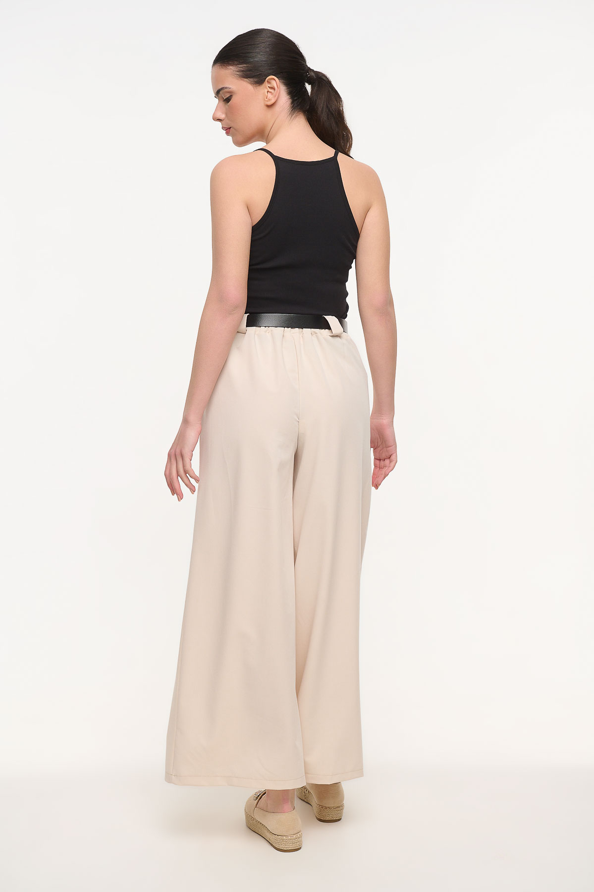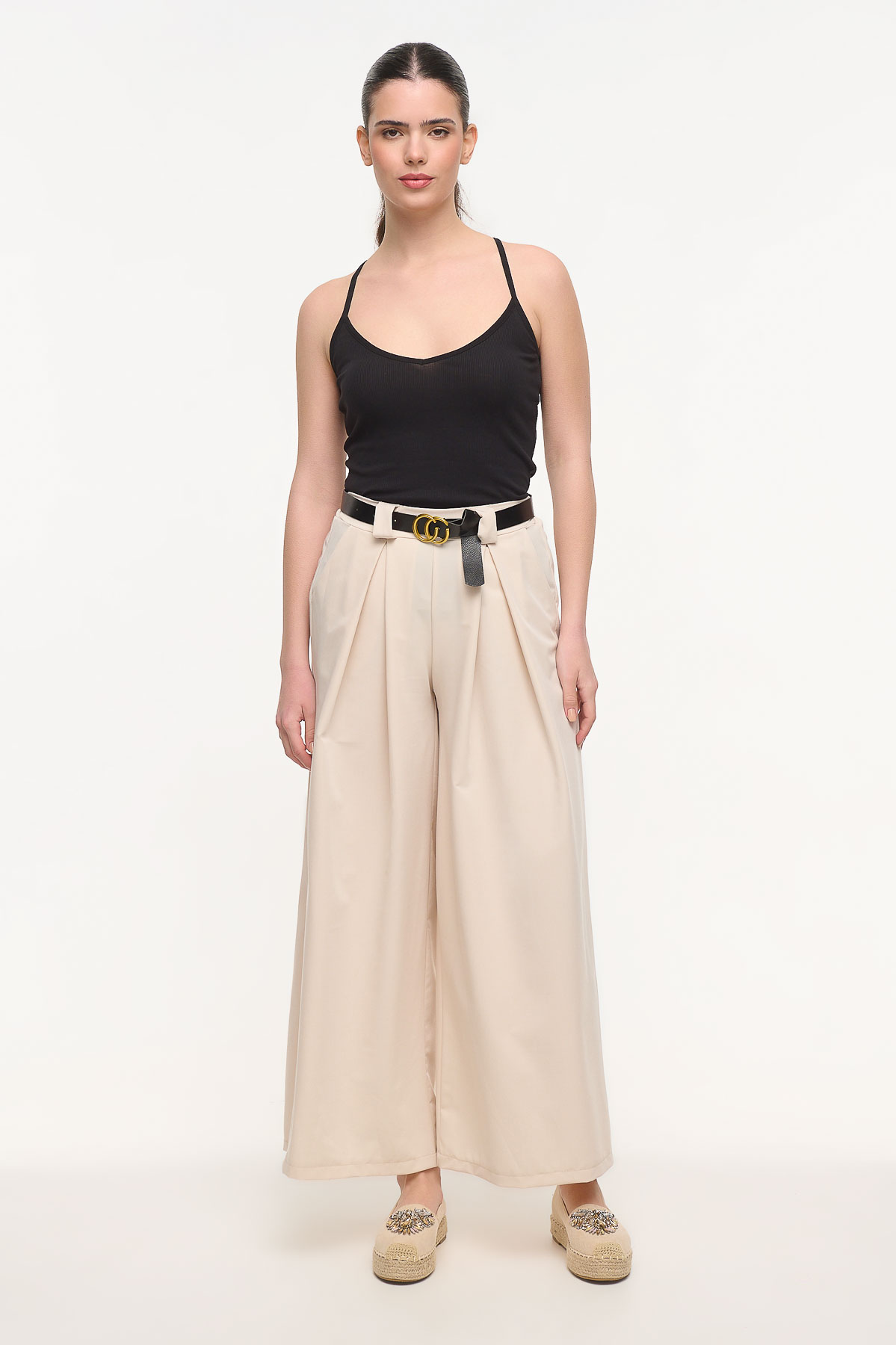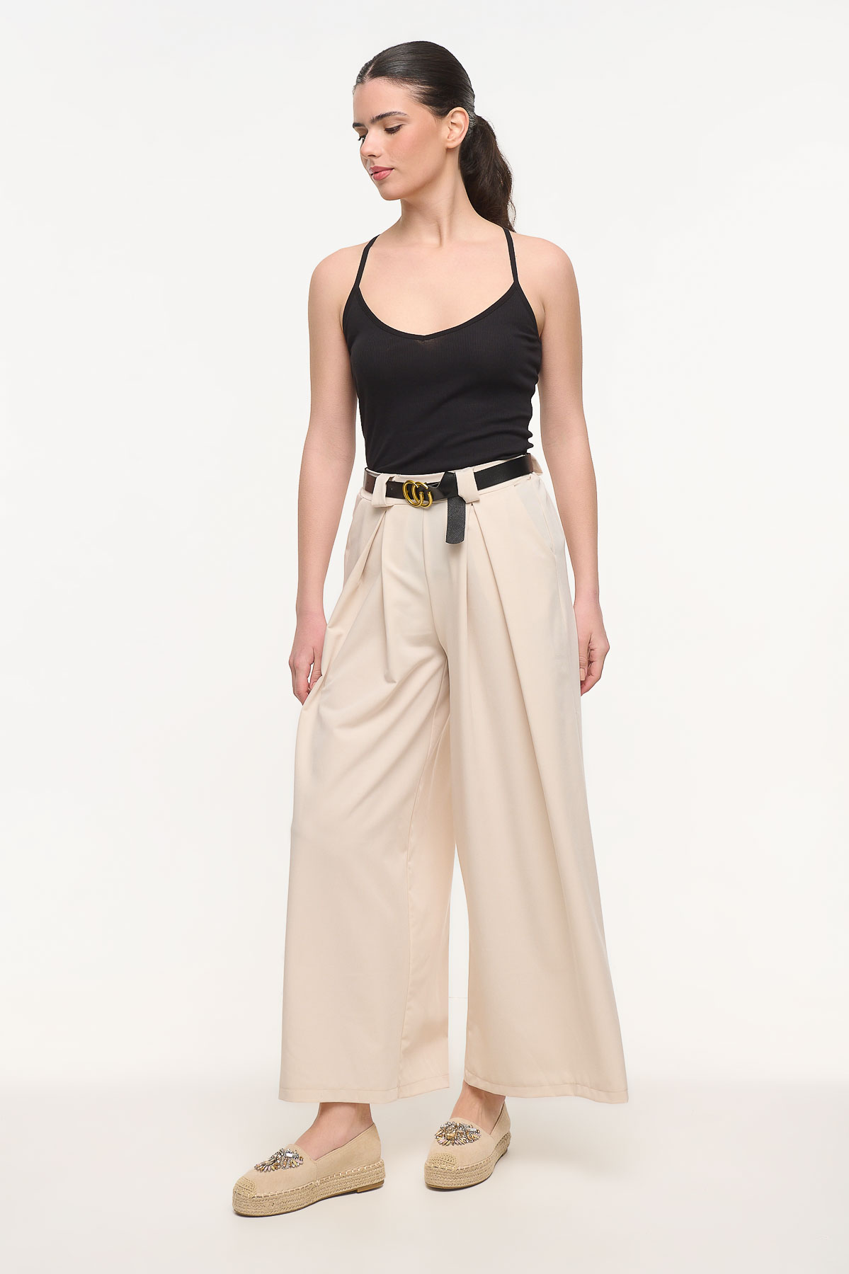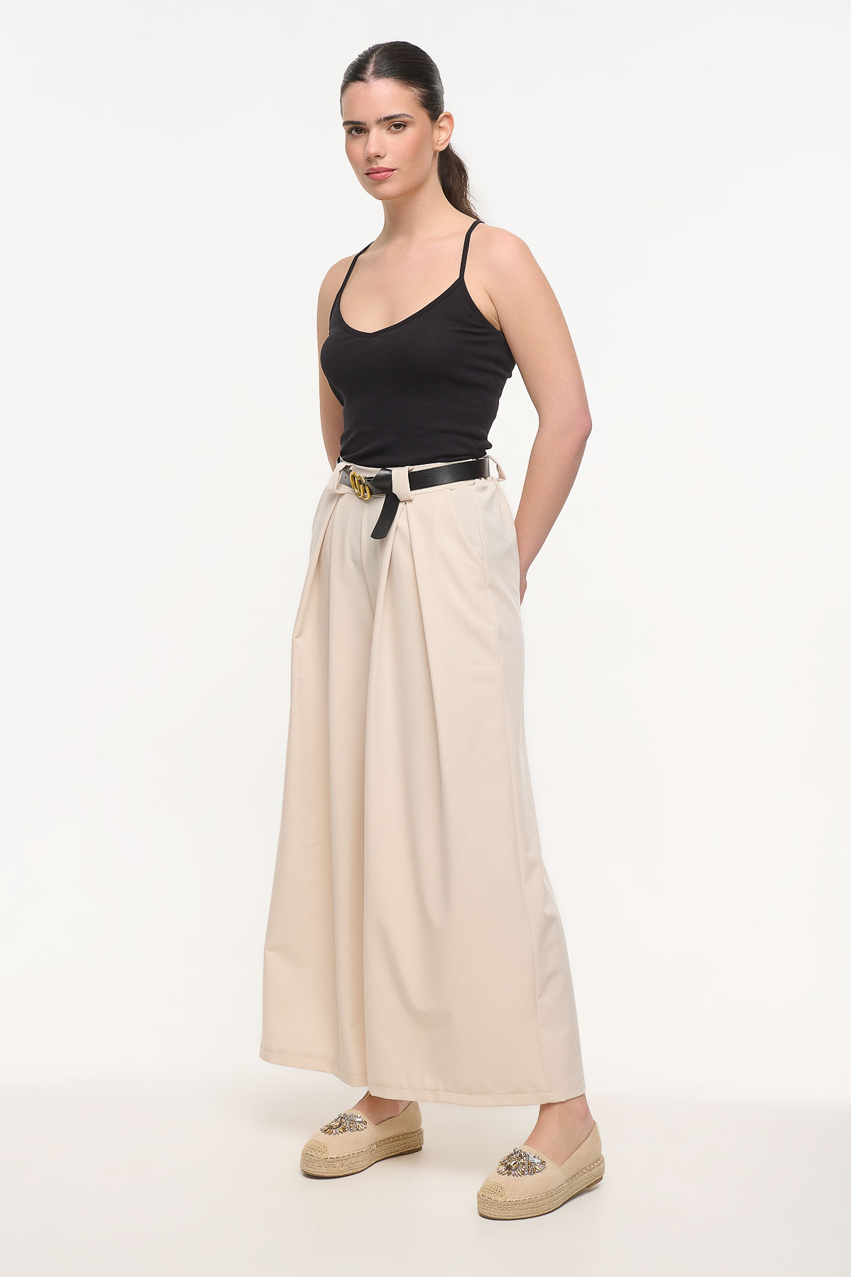 Κομψή παντελόνα με πιέτες που συνδυάζει άνεση και διαχρονικό στυλ. Η ψηλόμεση γραμμή και οι μπροστινές πιέτες δημιουργούν μια elegant και μοντέρνα σιλουέτα, ενώ το λάστιχο στο πίσω μέρος της μέσης προσφέρει άνετη εφαρμογή και καλύτερη προσαρμογή στο σώμα. Διαθέτει πρακτικές πλαϊνές τσέπες και φαρδιά γραμμή που χαρίζει κίνηση και κομψότητα σε κάθε εμφάνιση. Μπορεί να φορεθεί από το πρωί έως το βράδυ, συνδυασμένη με πουκάμισα, tops ή t-shirts για casual ή πιο sophisticated looks. Είναι one size με μήκος 105 cm και κατασκευασμένη από ύφασμα με σύνθεση 58% πολυεστέρα και 38% βισκόζη για άνεση και όμορφη εφαρμογή.