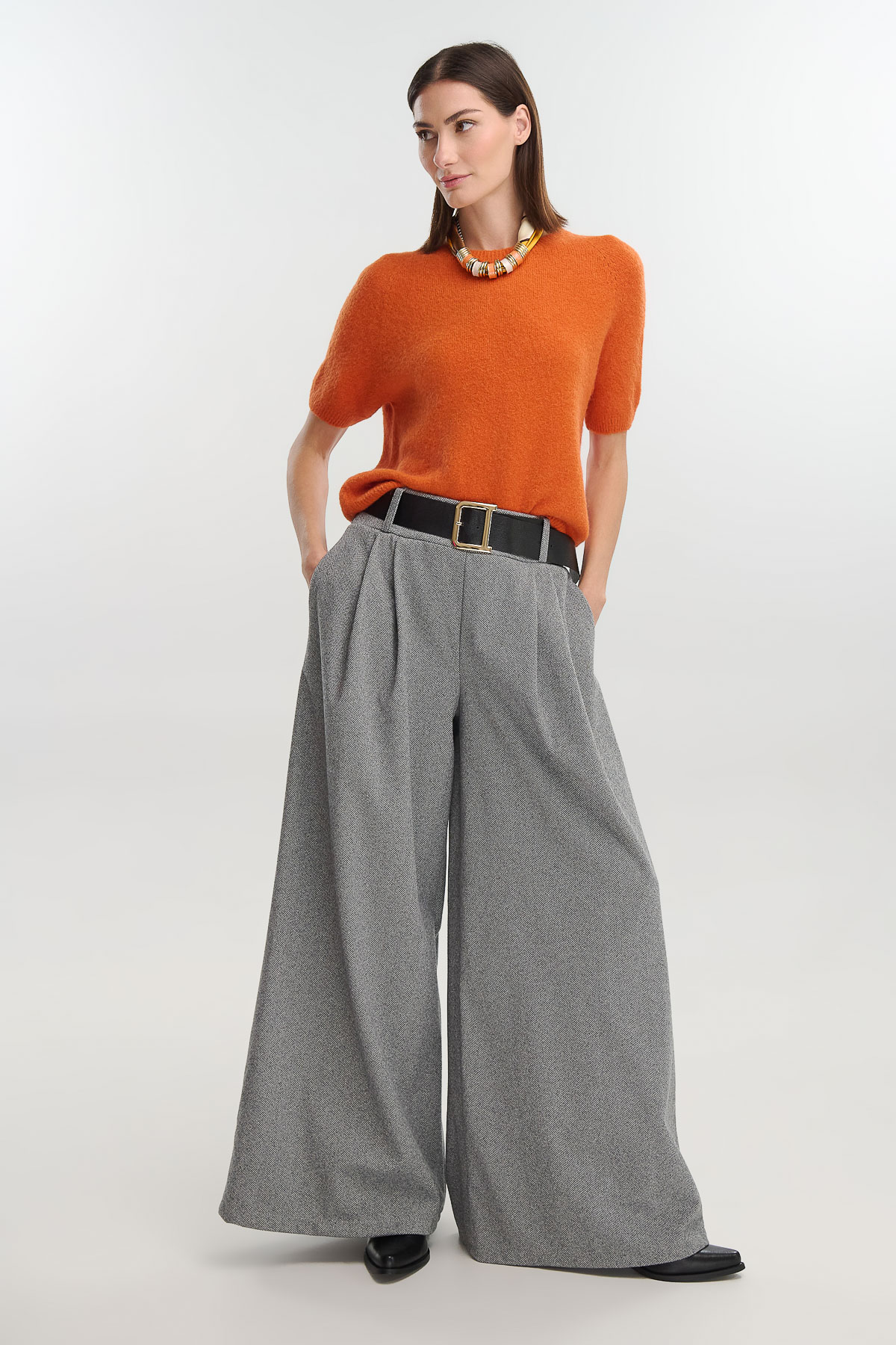 Εντυπωσιακή παντελόνα σε φαρδιά γραμμή με διακριτικό σχέδιο ψαροκόκαλο, ιδανική για κομψές και άνετες εμφανίσεις. Διαθέτει πιέτες μπροστά που προσθέτουν κίνηση και δομή,λάστιχο στη μέση στο πίσω μέρος ,ενώ η μαύρη ζώνη με χρυσή αγκράφα τονίζει τη μέση με στυλ.