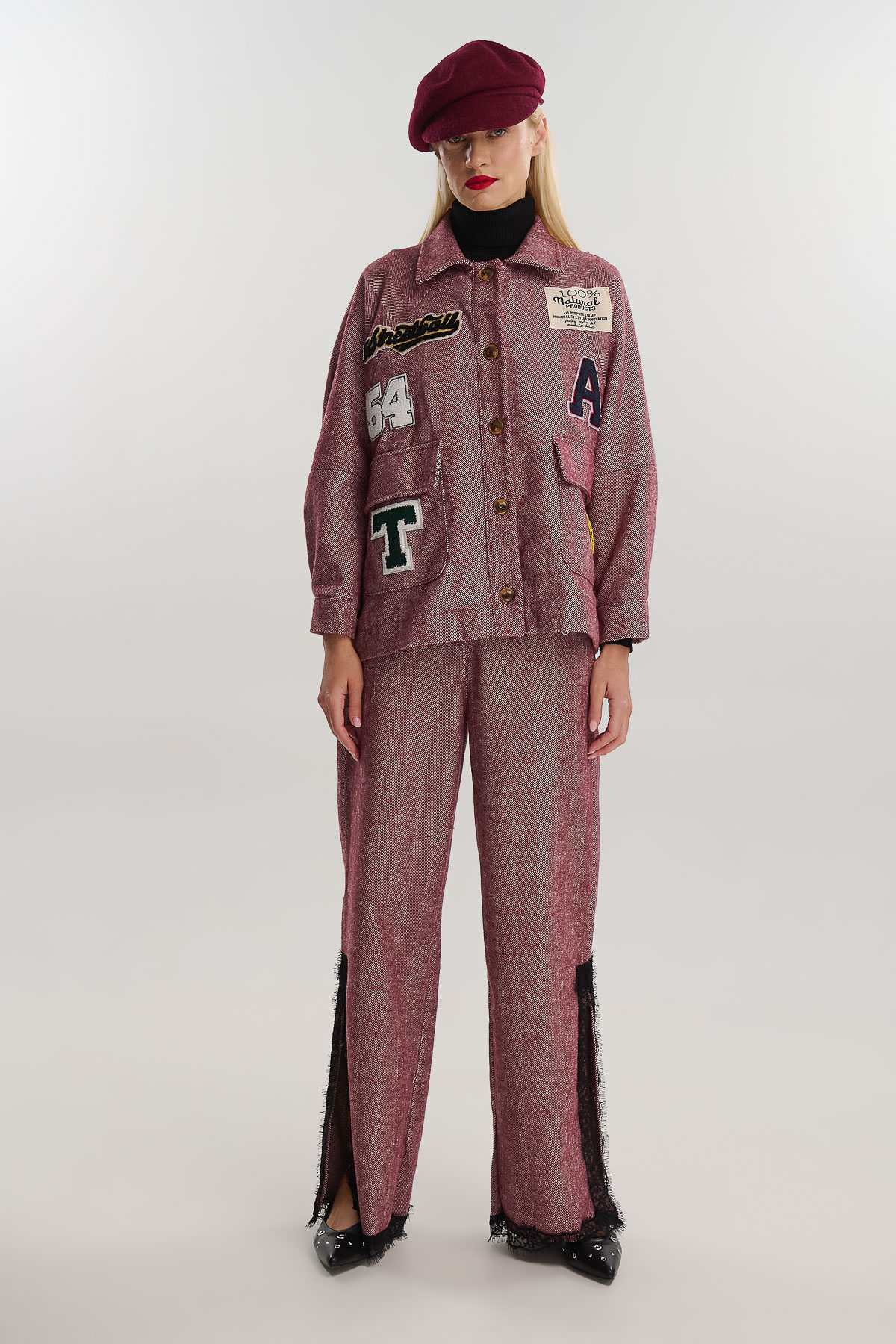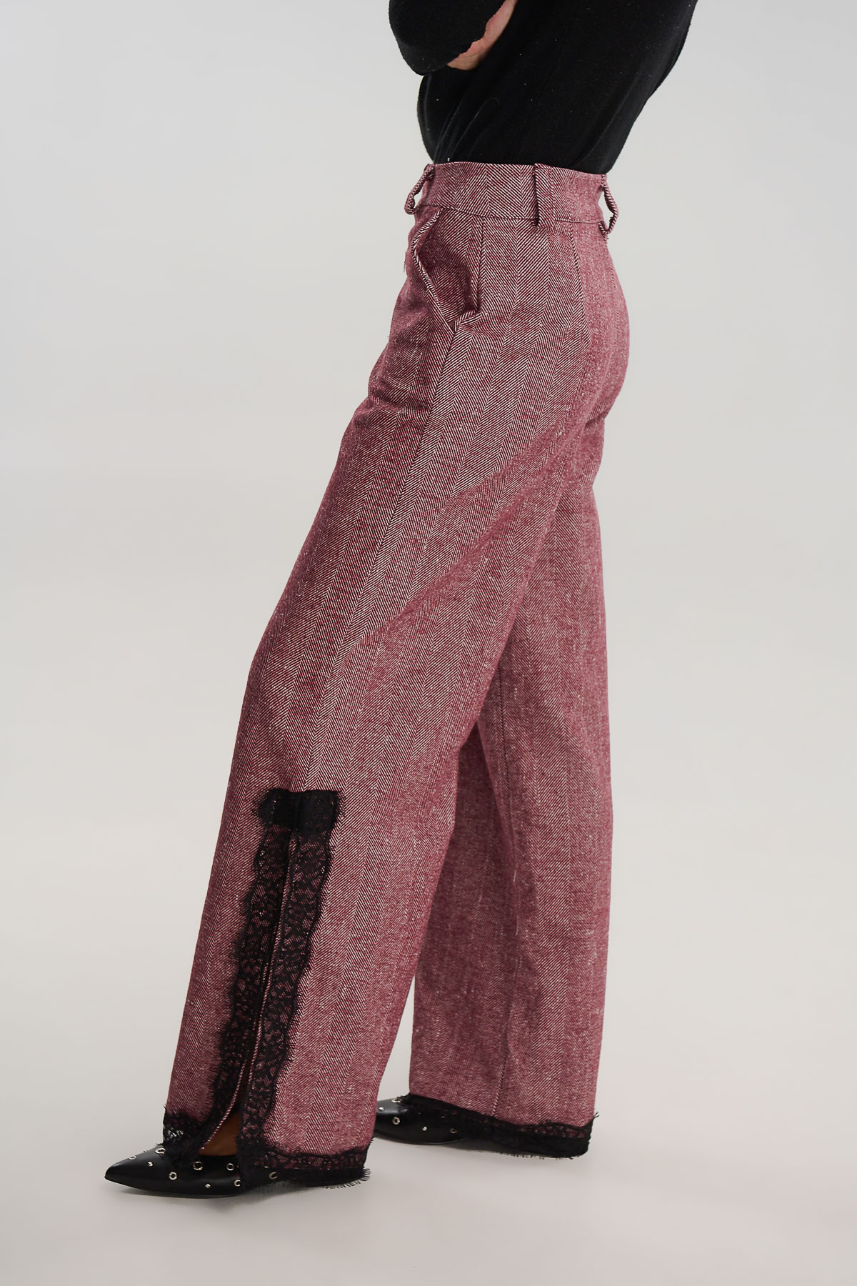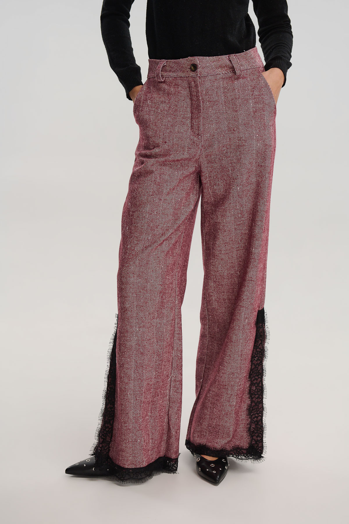 Εντυπωσιακό παντελόνι σε ίσια γραμμή με ιδιαίτερη υφή ψαροκόκαλου και δαντέλα στο τελείωμα. Το σχέδιο συνδυάζει την κομψότητα του κλασικού tailoring με μια ρομαντική πινελιά, χάρη στη μαύρη δαντέλα που διακοσμεί το κάτω μέρος και τα πλαϊνά ανοίγματα.