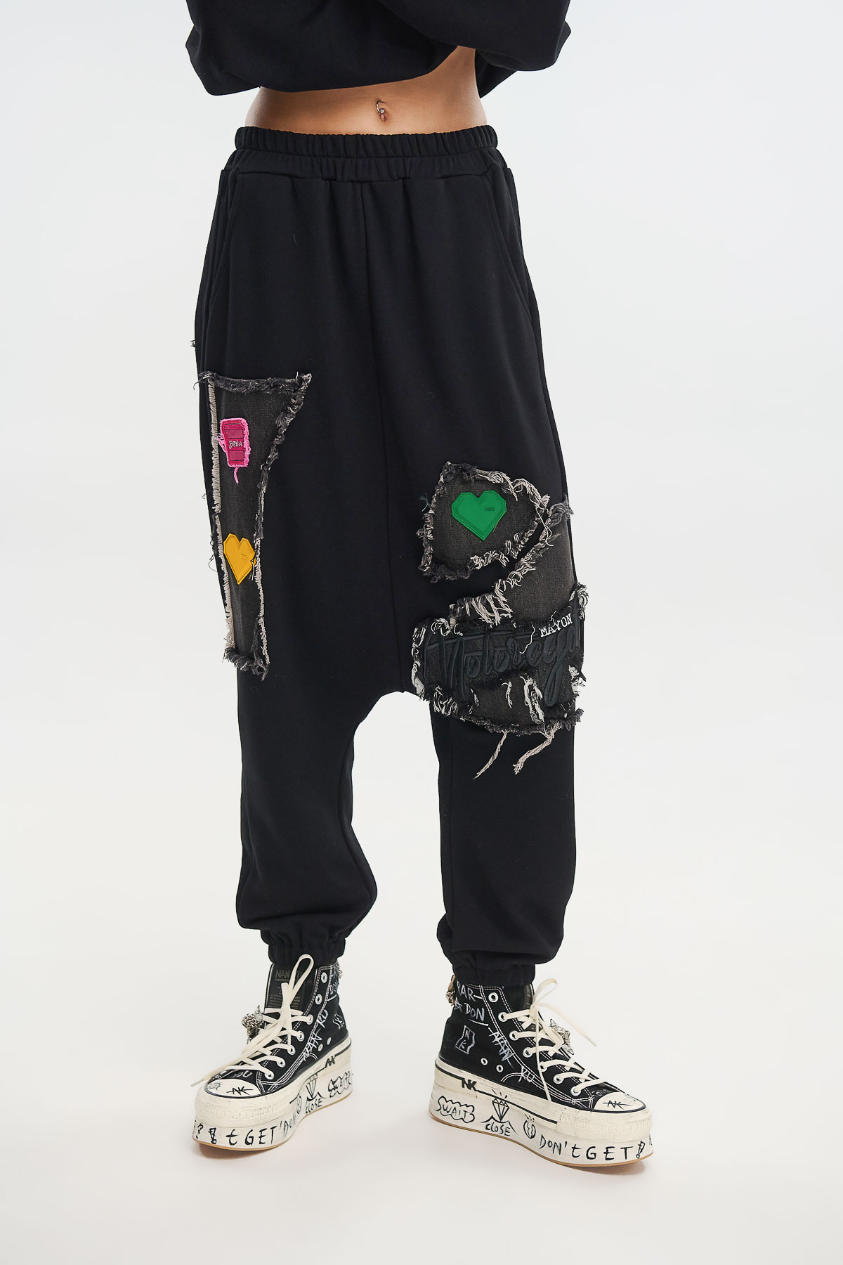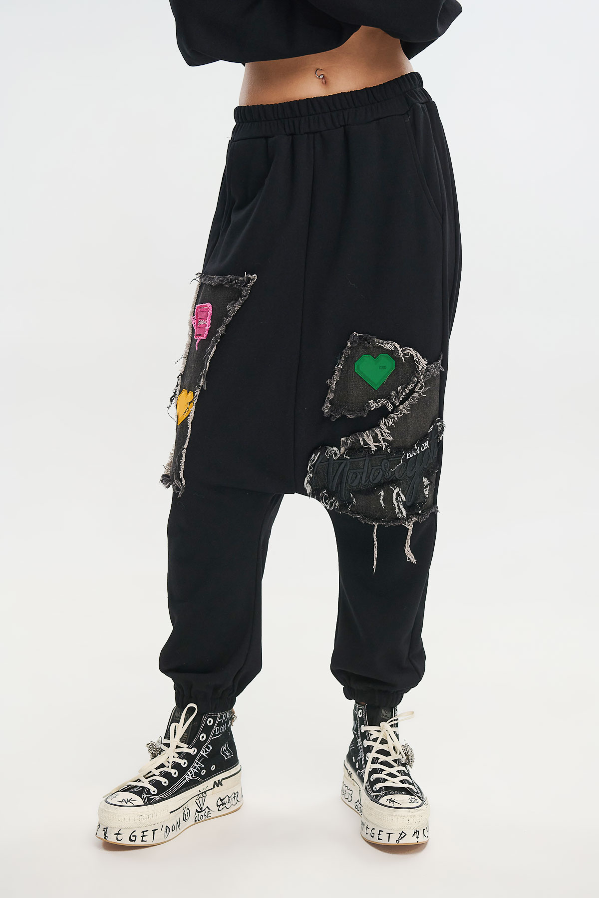 Διαθέτει λάστιχο στη μέση και στους αστραγάλους για άνεση και σταθερή εφαρμογή, ενώ τα πολύχρωμα patches με ανάγλυφες καρδιές δίνουν παιχνιδιάρικο και τολμηρό ύφος.