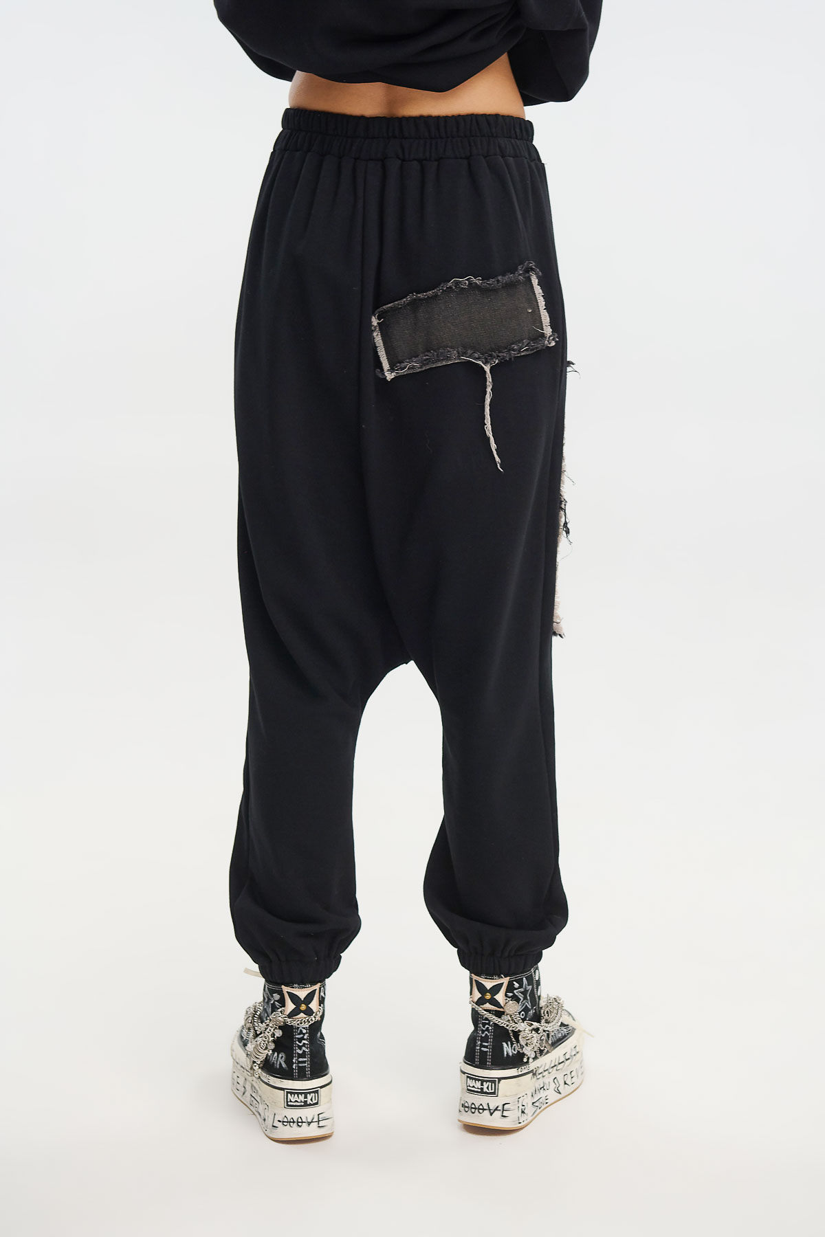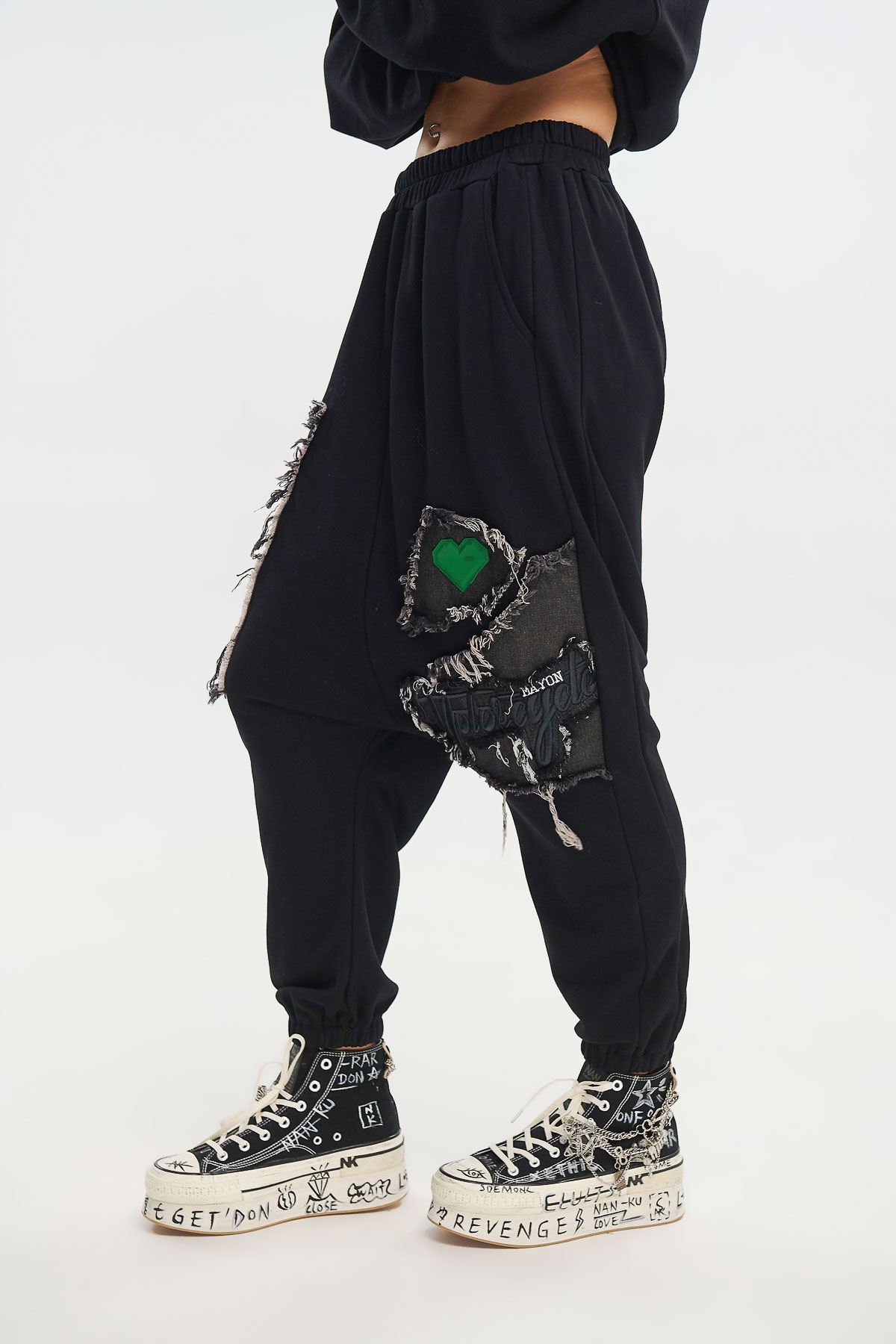 Άνετο παντελόνι φόρμας με χαλαρή γραμμή και ιδιαίτερα 3D απλικέ patches σε έντονα χρώματα. Οι ξεφτισμένες λεπτομέρειες και οι χειροποίητες ραφές χαρίζουν urban αισθητική και street χαρακτήρα, ιδανικό για casual εμφανίσεις με προσωπικότητα.