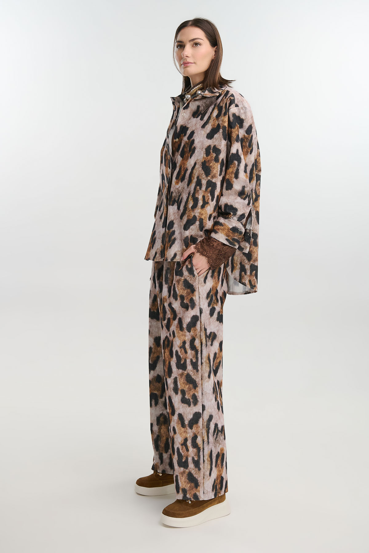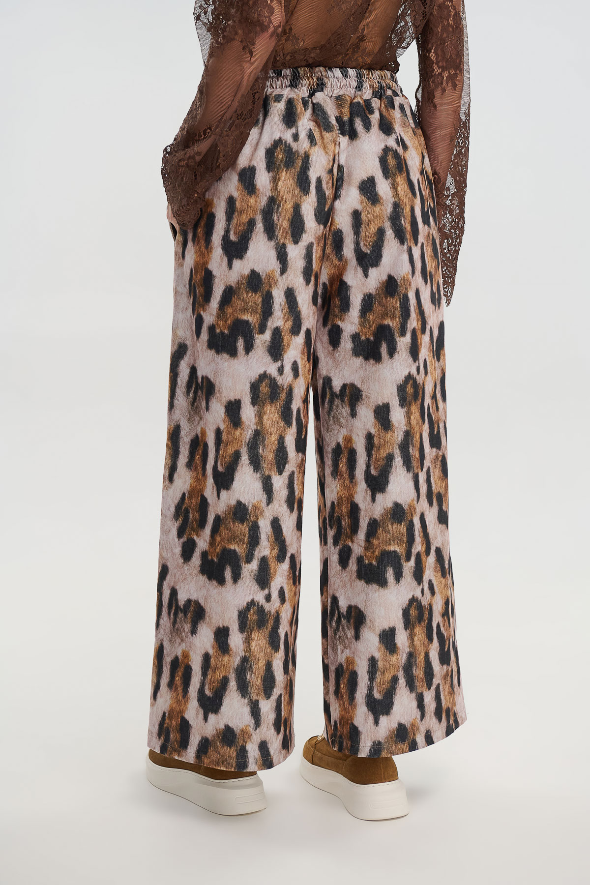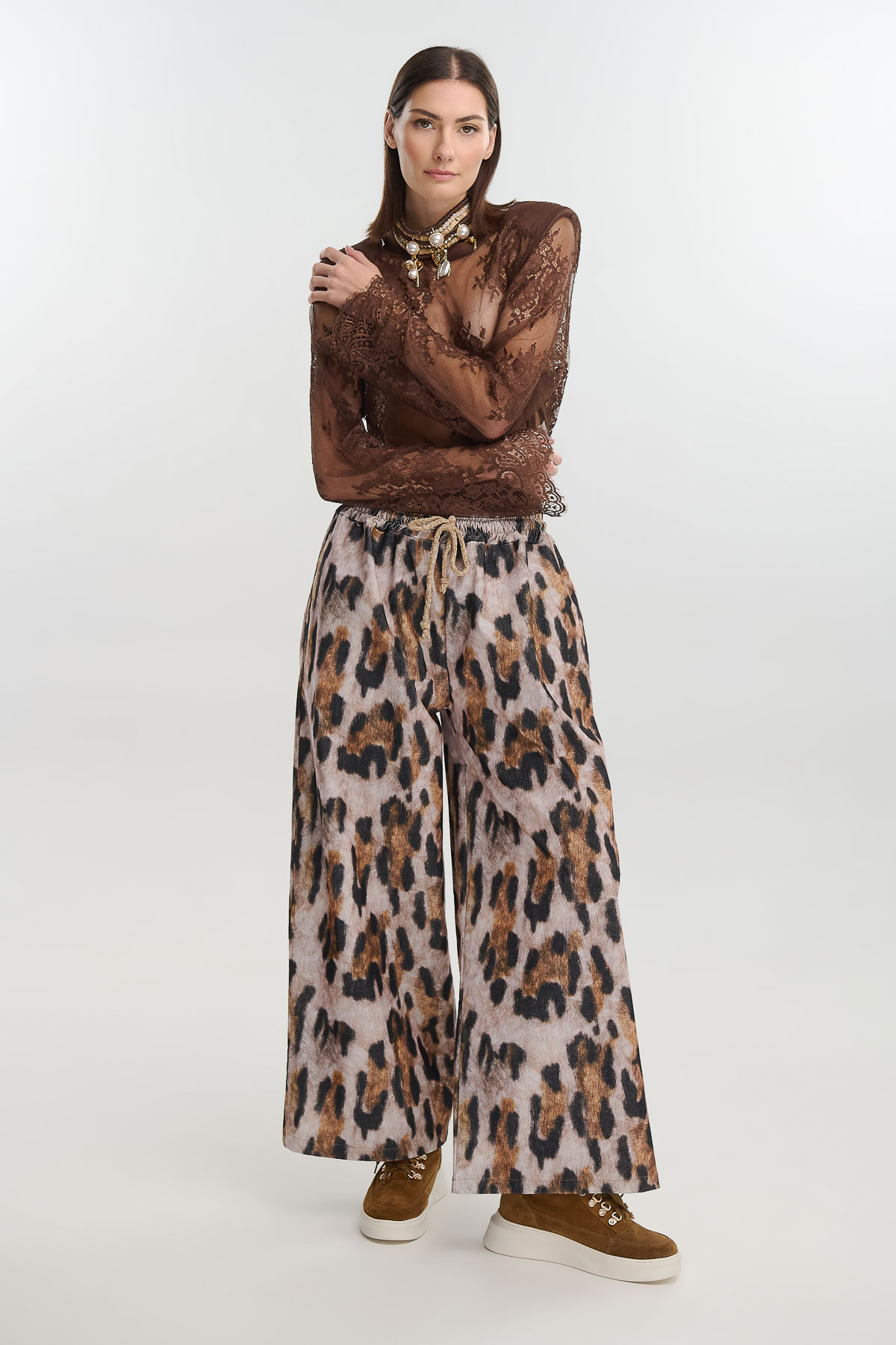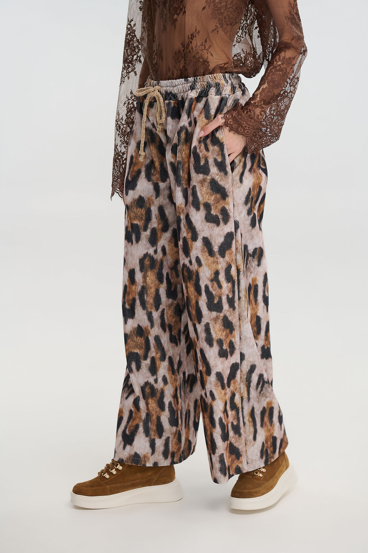Παντελόνι σε φαρδιά γραμμή με έντονο animal print που αναδεικνύει κάθε εμφάνιση με δυναμισμό. Από απαλό, ελαστικό κοτλέ ύφασμα που χαρίζει άνεση και στιλ, διαθέτει λάστιχο στη μέση με κορδόνι για προσαρμοζόμενη εφαρμογή.