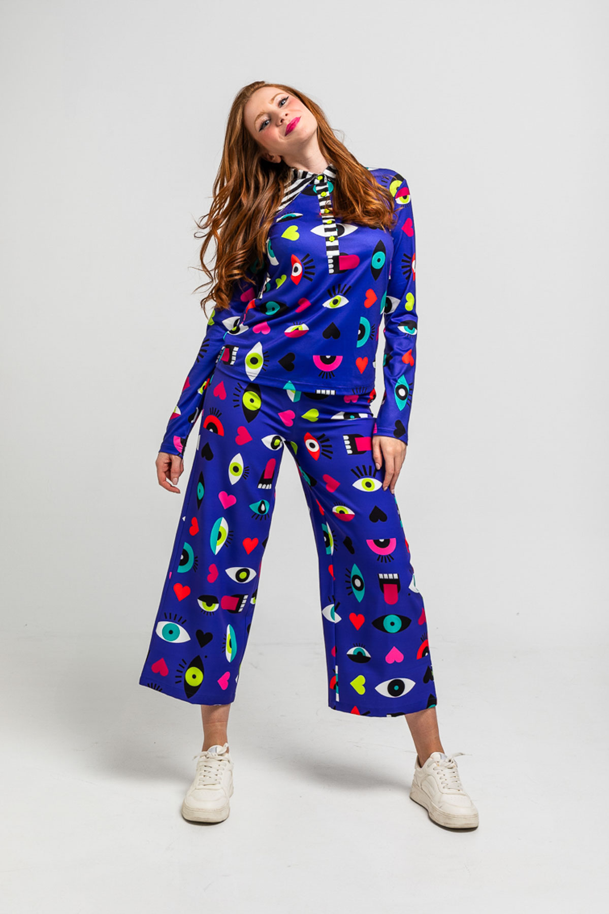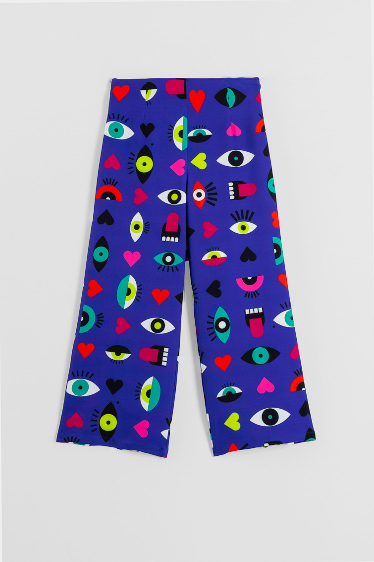 Παντελόνι Lolina σε μωβ βάση με εντυπωσιακό μοτίβο από μάτια, καρδιές και στόματα. Σχεδιασμένο σε μεσαίο καβάλο με άνετη εφαρμογή και κοντή, φαρδιά γραμμή που προσφέρει ελευθερία κινήσεων. Κλείσιμο με πλαϊνό φερμουάρ για τέλεια εφαρμογή στη μέση. Ένα ιδιαίτερο κομμάτι που δίνει παιχνιδιάρικη και καλλιτεχνική διάθεση σε κάθε look.Σύνθεση: 100% Πολυέστερ . Πλύσιμο στο πλυντήριο σε κρύο νερό . Όχι λευκαντικό . Όχι στεγνωτήριο.