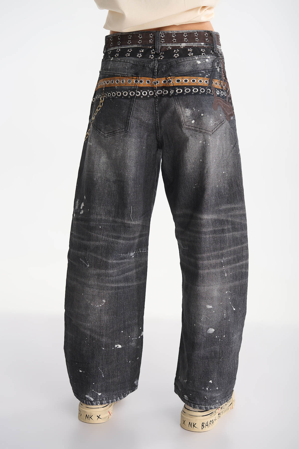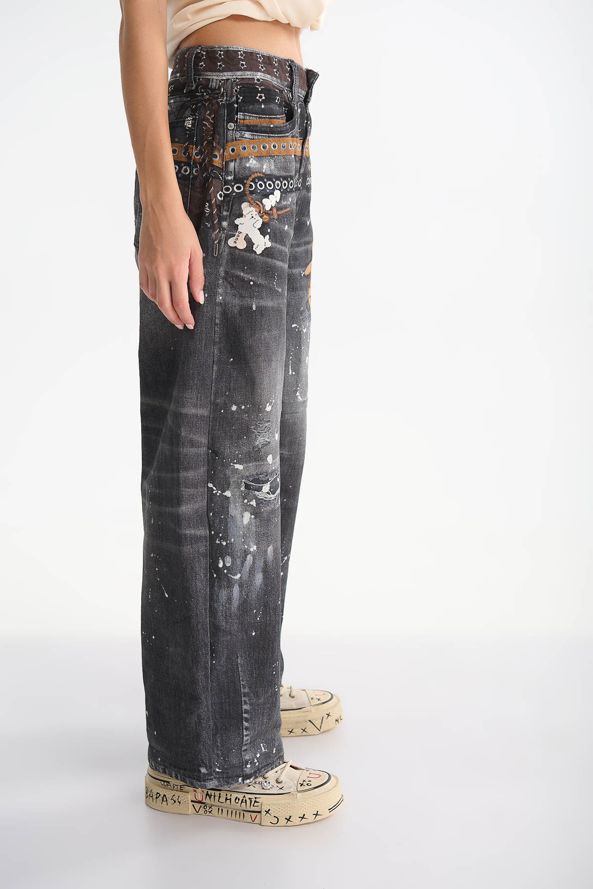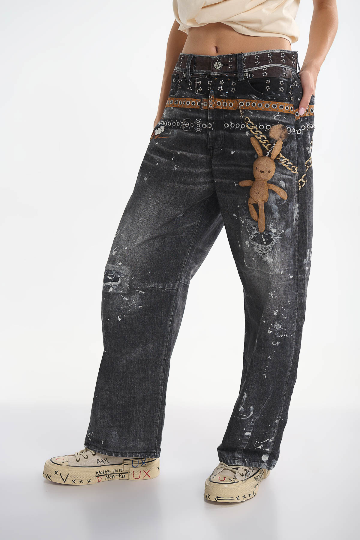 Παντελόνι τζιν σε χαλαρή, straight γραμμή με μοναδικό, καλλιτεχνικό σχέδιο. Διαθέτει ιδιαίτερο print που μιμείται ζώνες, τρουκς, αλυσίδες και λούτρινο κουνελάκι, δημιουργώντας την αίσθηση τρισδιάστατων λεπτομερειών. Το ξεθωριασμένο γκρι χρώμα με “λεκέδες” σε λευκές αποχρώσεις προσθέτει μια grunge, streetwear διάθεση.
