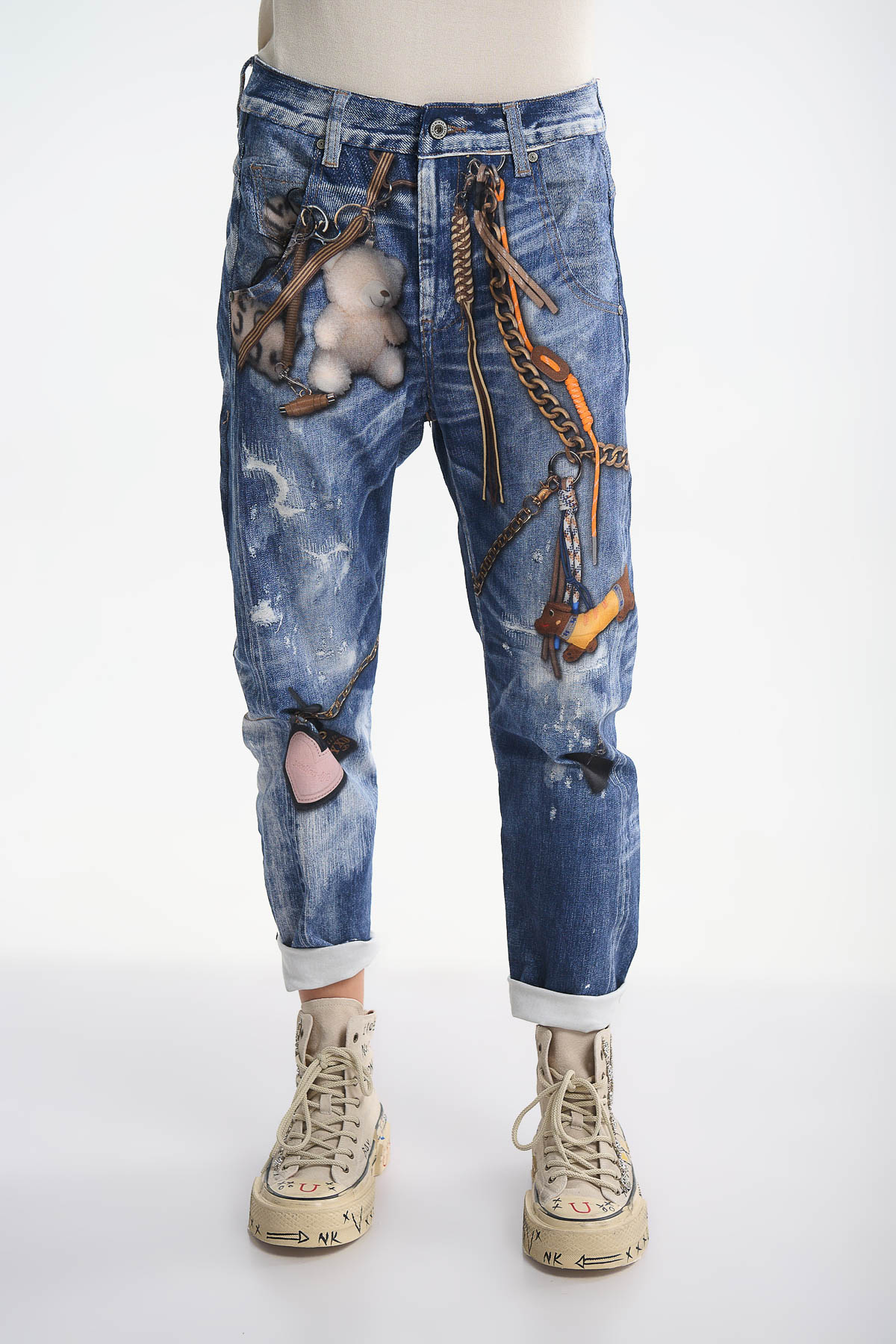 Ανακάλυψε το απόλυτο statement παντελόνι της σεζόν! Τζιν με μοναδικό εφέ από charms και σχέδιο teddy bear, που δίνει playful και fashion-forward χαρακτήρα στο look σου.Σχέδιο με 3D εφέ αλυσίδες, charms και teddy bear . Casual, boyfriend γραμμή για άνεση . Ξεχωριστή, washed εμφάνιση , Ιδανικό για cool street style εμφανίσεις . Το μοντέλο φοράει μέγεθος S. Σύνθεση: 100% Cotton. 98% Cotton – 2% Elasthan .