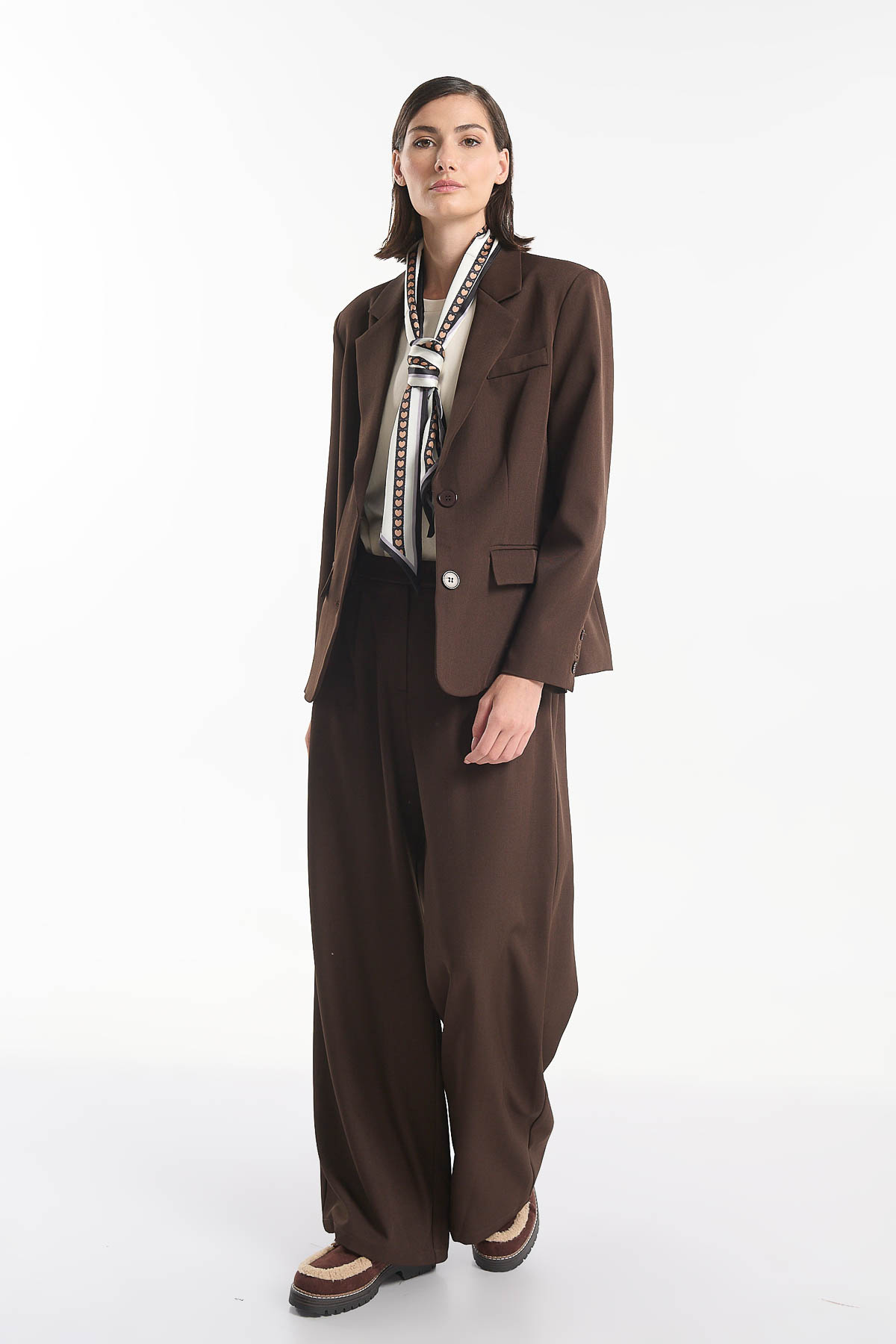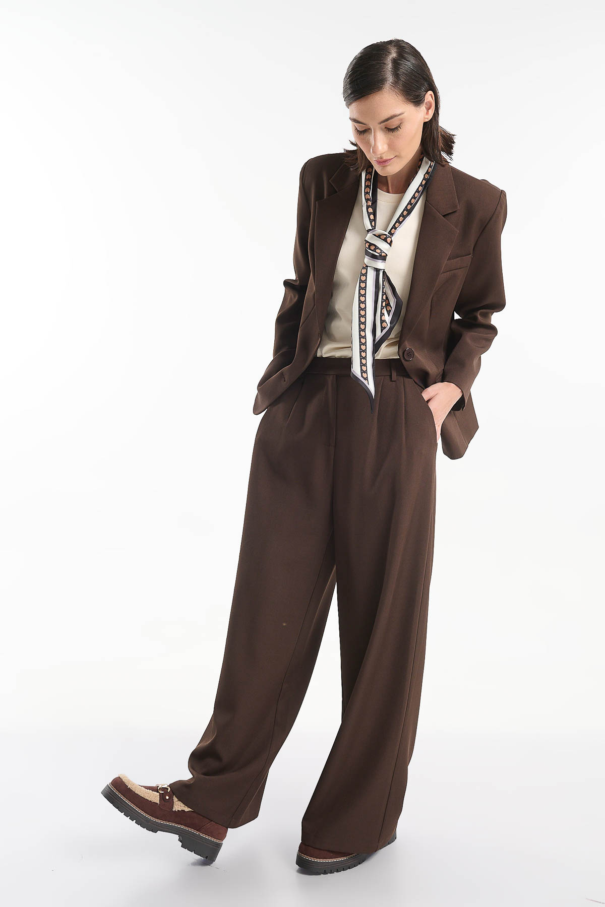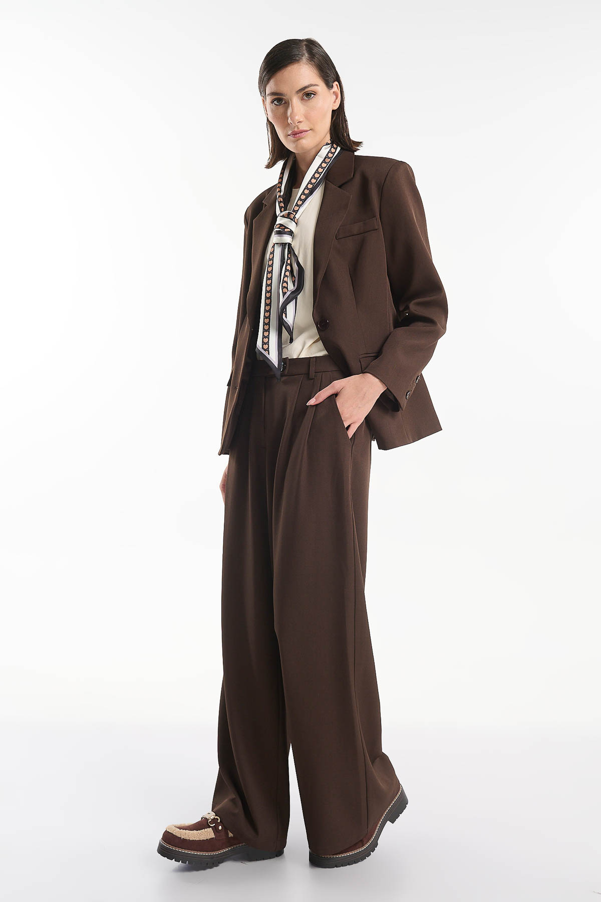 Αναβαθμίστε το στυλ σας με αυτήν την κομψή παντελόνα σε φαρδιά γραμμή. Διαθέτει κλασικό σχεδιασμό με πιέτες στο μπροστινό μέρος, πλαϊνές τσέπες και κουμπί στη μέση για τέλεια εφαρμογή. Ιδανική για επαγγελματικές εμφανίσεις αλλά και για casual chic look, συνδυάζεται άψογα με σακάκι για total office outfit ή με πουκάμισο για πιο χαλαρές περιστάσεις. Διατίθεται σε μαύρο και καφέ χρώμα. Το μοντέλο φοράει μέγεθος S . Το small καλύπτει περιφέρεια μέσης 79 cm . Σύνθεση : 95% Polyester – 5% Spandex.
