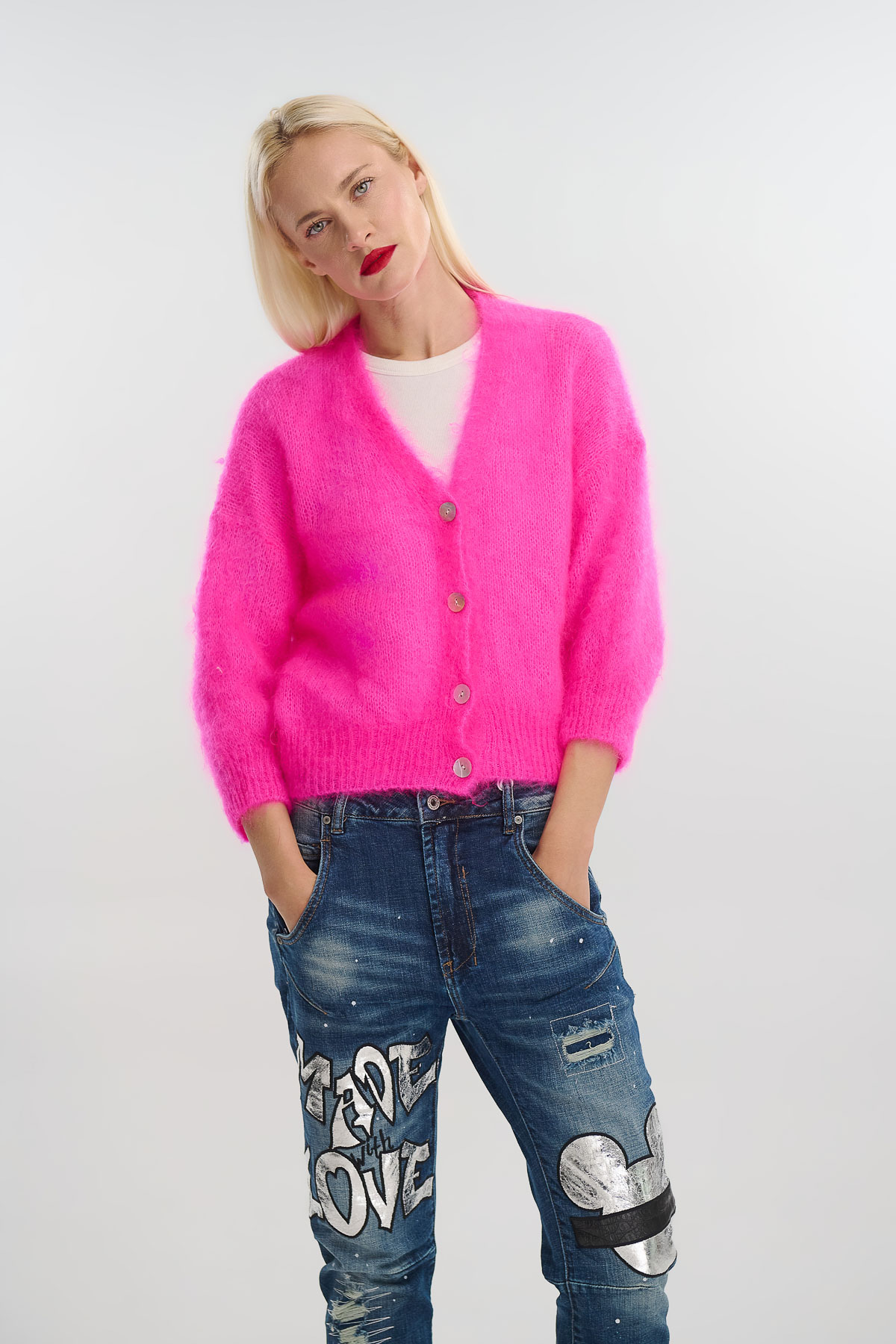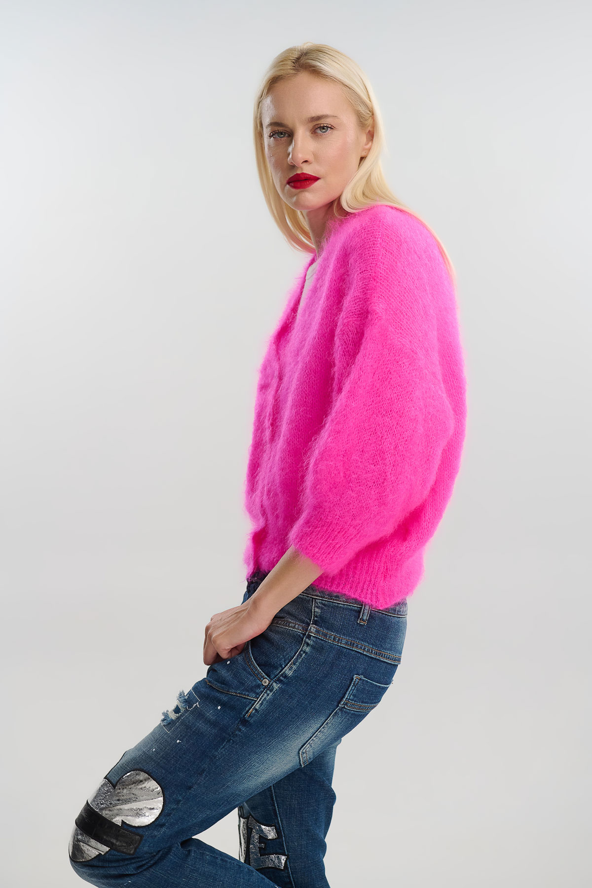 Απαλή, ανάλαφρη και εξαιρετικά cozy ζακέτα από 80% μοχαίρ, που συνδυάζει τη ζεστασιά με τη θηλυκή κομψότητα. Διαθέτει V λαιμόκοψη, κουμπιά φίλντισι στο μπροστινό μέρος και balloon μανίκια που προσδίδουν έναν ανάλαφρο, ρομαντικό όγκο.