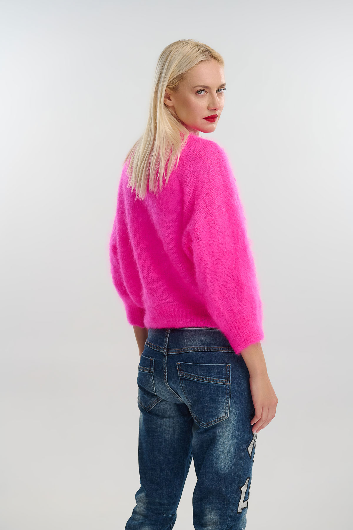 Η έντονη φούξια απόχρωση χαρίζει φως και χαρακτήρα σε κάθε σύνολο, ενώ η cropped γραμμή της την καθιστά ιδανική για styling με ψηλόμεσα τζιν, φούστες ή παντελόνες. Ένα premium knitwear κομμάτι που ξεχωρίζει για την υφή και το στυλ του. Σύνθεση : 80% mohair – 18% Polyamid – 2% Elasthan.