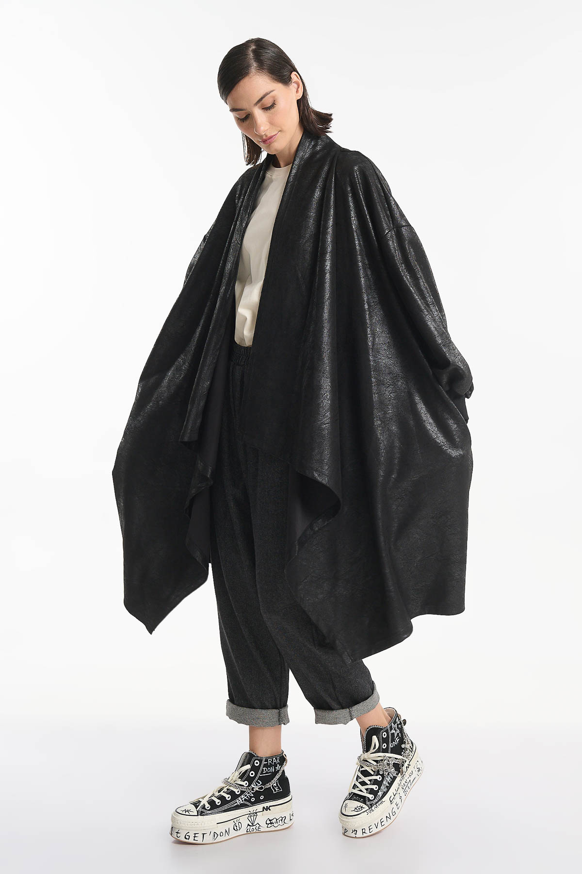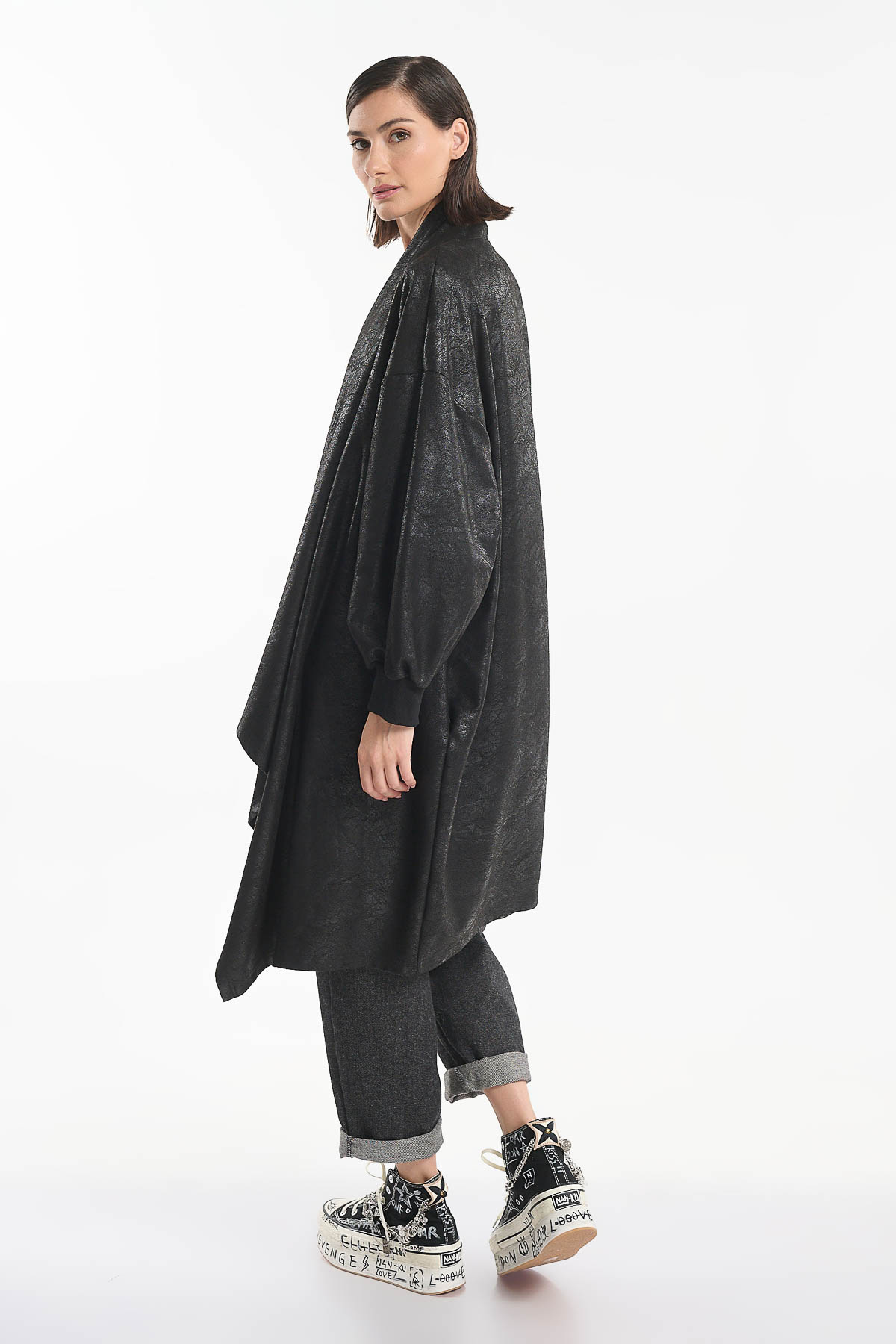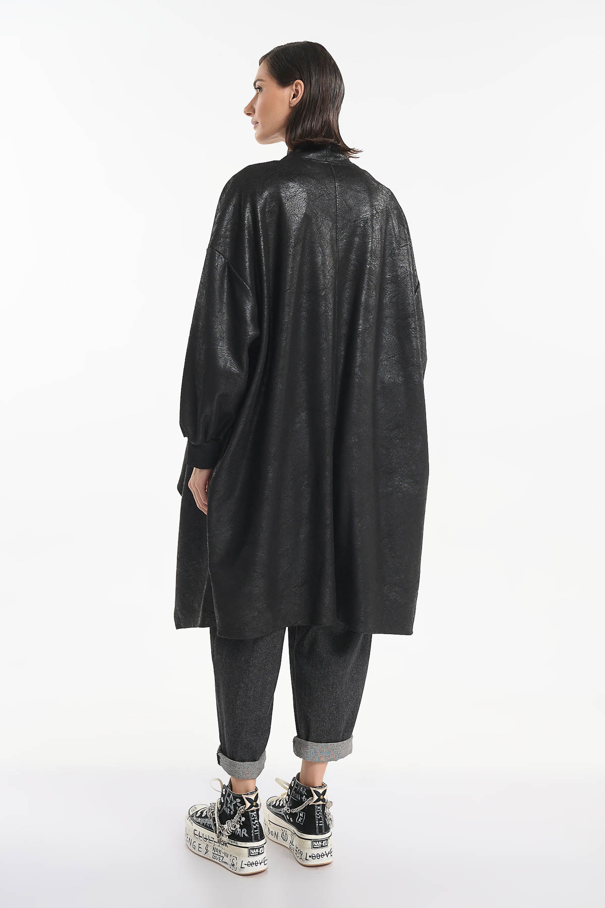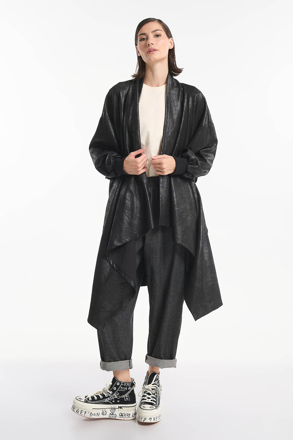 Cardigan από οικολογικό δέρμα, σε εντυπωσιακή ασύμμετρη γραμμή που χαρίζει κίνηση και στυλ σε κάθε εμφάνιση. Διαθέτει χαλαρή oversized εφαρμογή , πλαϊνές τσέπες . Μήκος : 110 cm . Ένα statement κομμάτι που μπορεί να φορεθεί από το πρωί μέχρι το βράδυ, ιδανικό για layering πάνω από φορέματα, πουκάμισα ή πλεκτά, ολοκληρώνοντας ένα σύγχρονο και ιδιαίτερο look. Σύνθεση : 92% Polyester – 8% Elasthan.