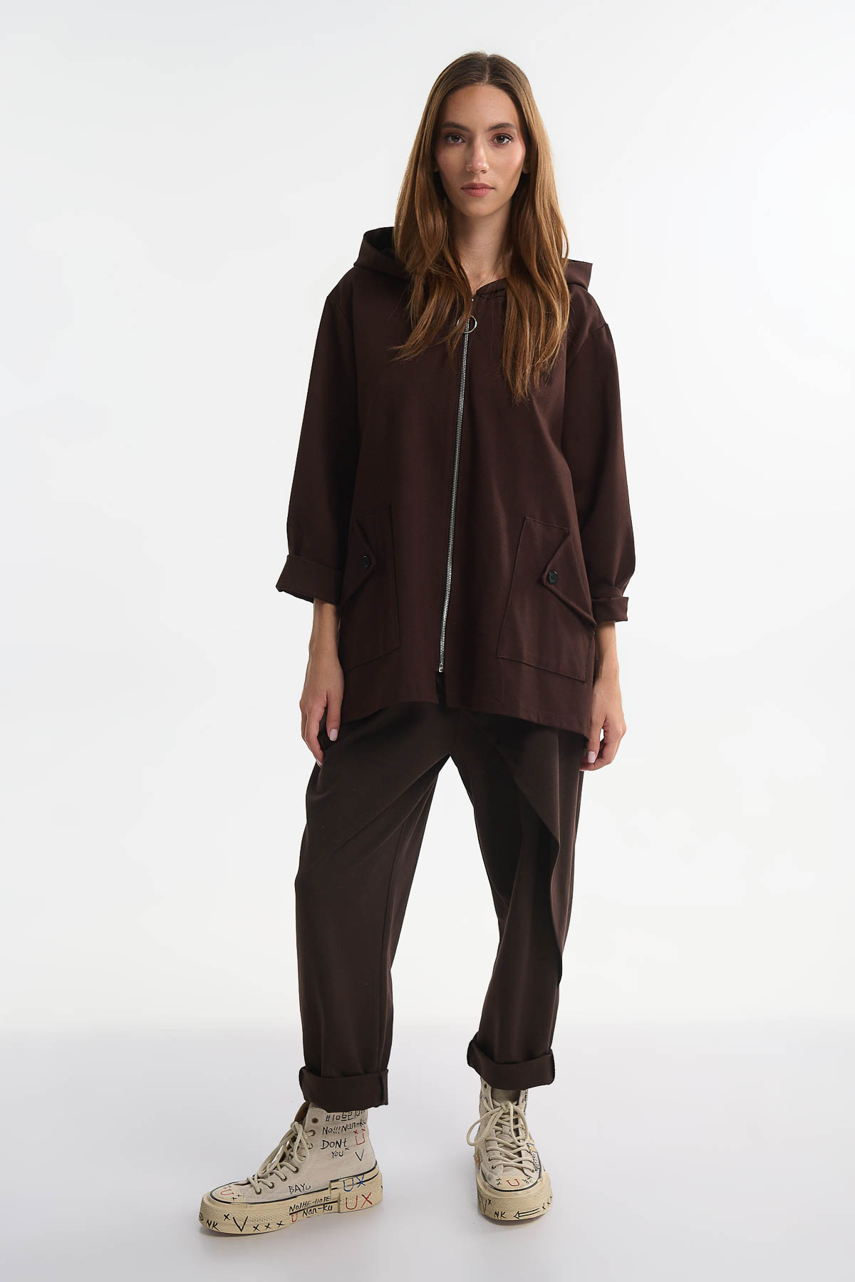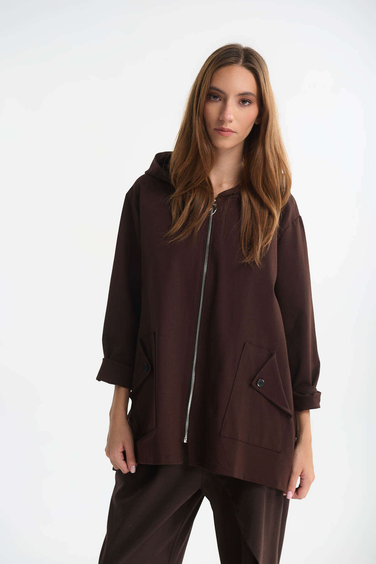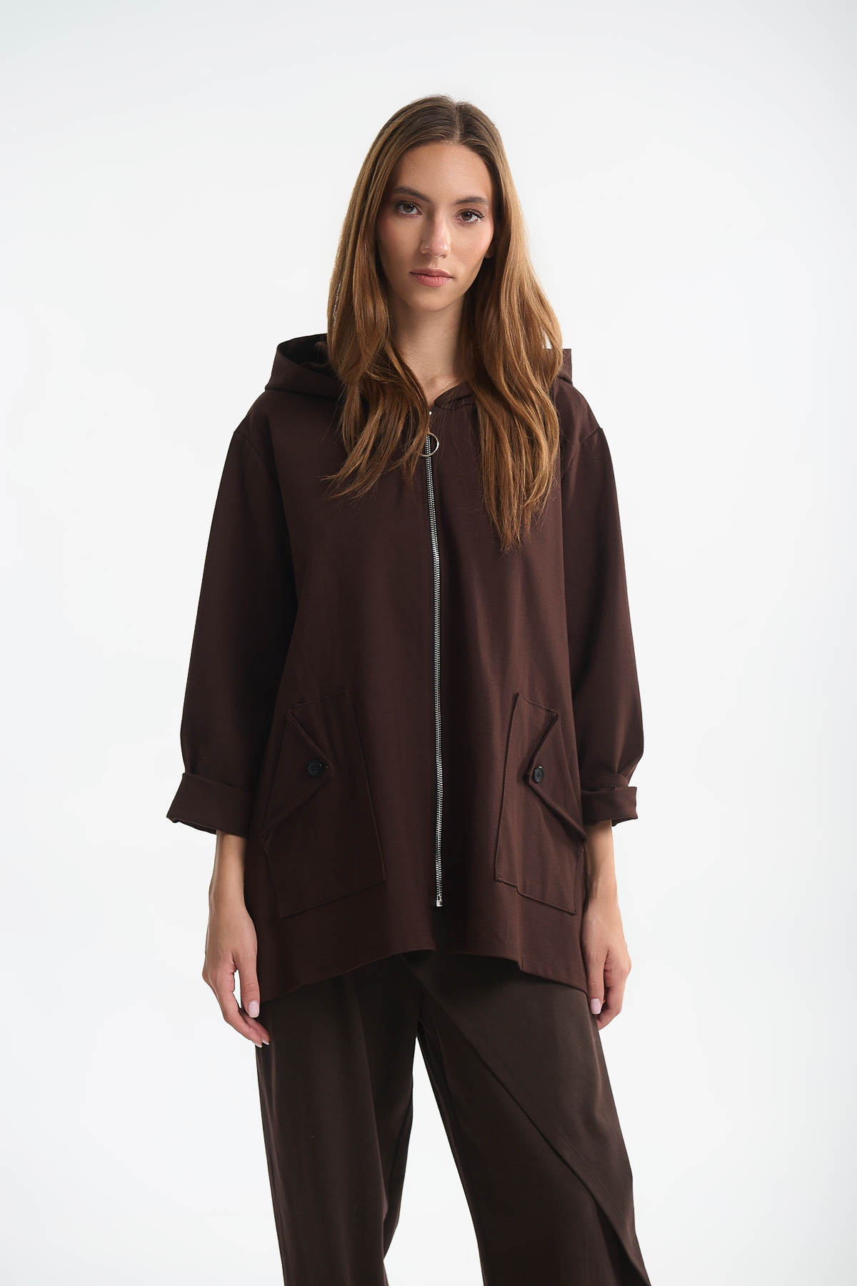 Μοντέρνα ζακέτα με χαλαρή γραμμή και ιδιαίτερο σχεδιασμό στην πλάτη με διακοσμητικά κουμπιά. Διαθέτει κουκούλα και φερμουάρ μπροστά, ενώ οι πρακτικές τσέπες ολοκληρώνουν το σχέδιο. Με μανίκια και άνετη εφαρμογή, αποτελεί ιδανική επιλογή για layered εμφανίσεις από το πρωί μέχρι το βράδυ. Είναι one size και καλύπτει απο XS έως 2XL , στήθος έως 124 cm . Σύνθεση : 70% Viscose – 30% Polyester.