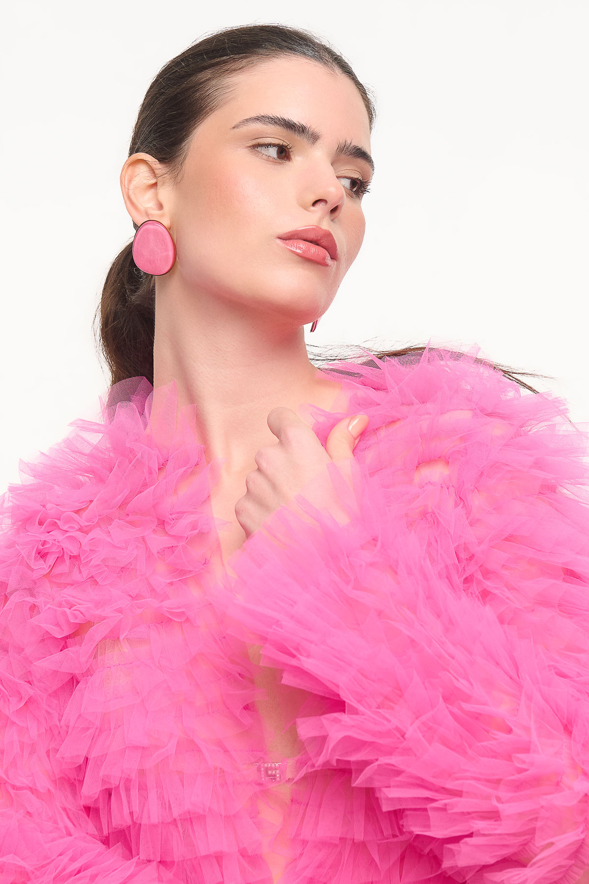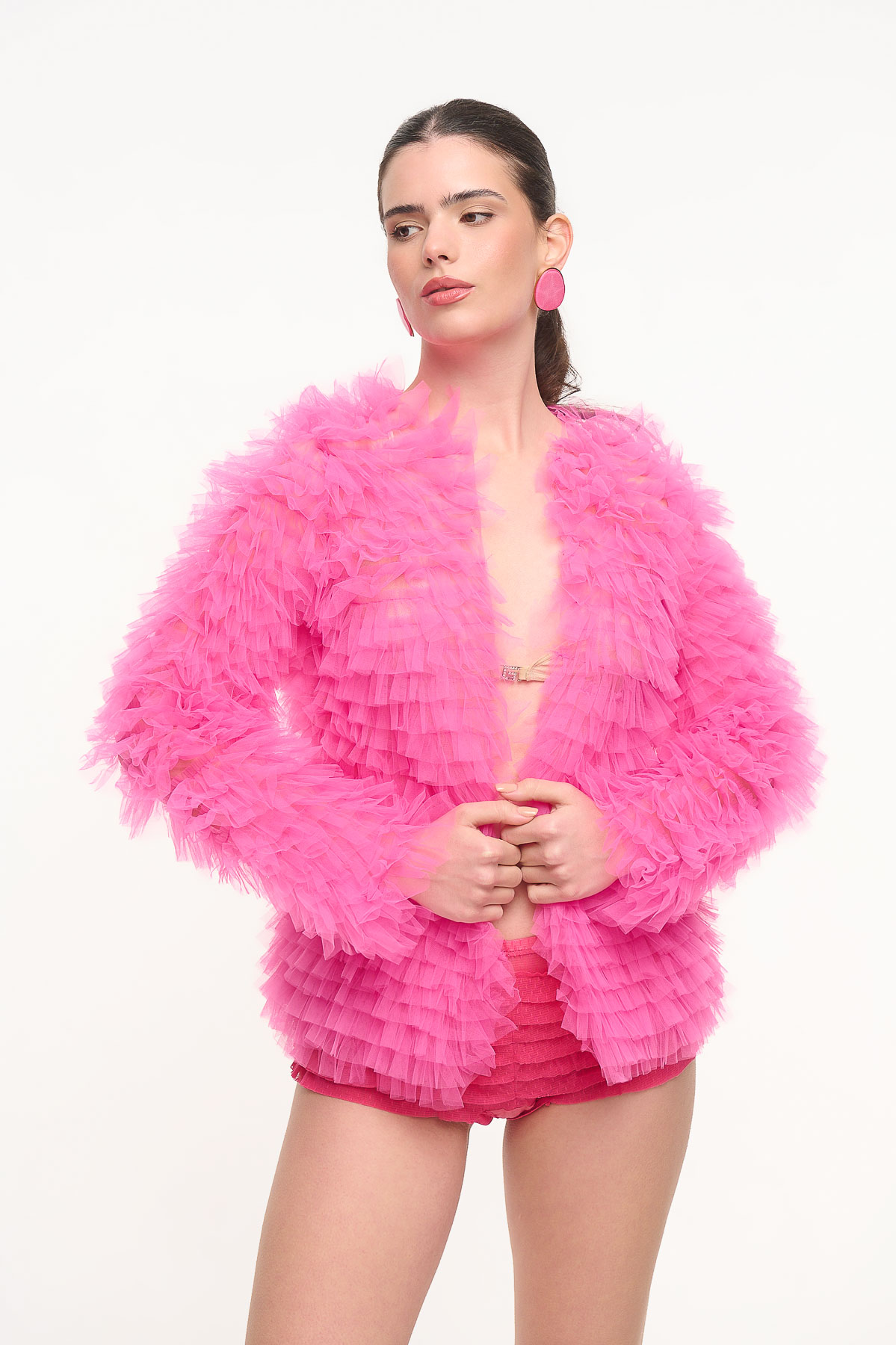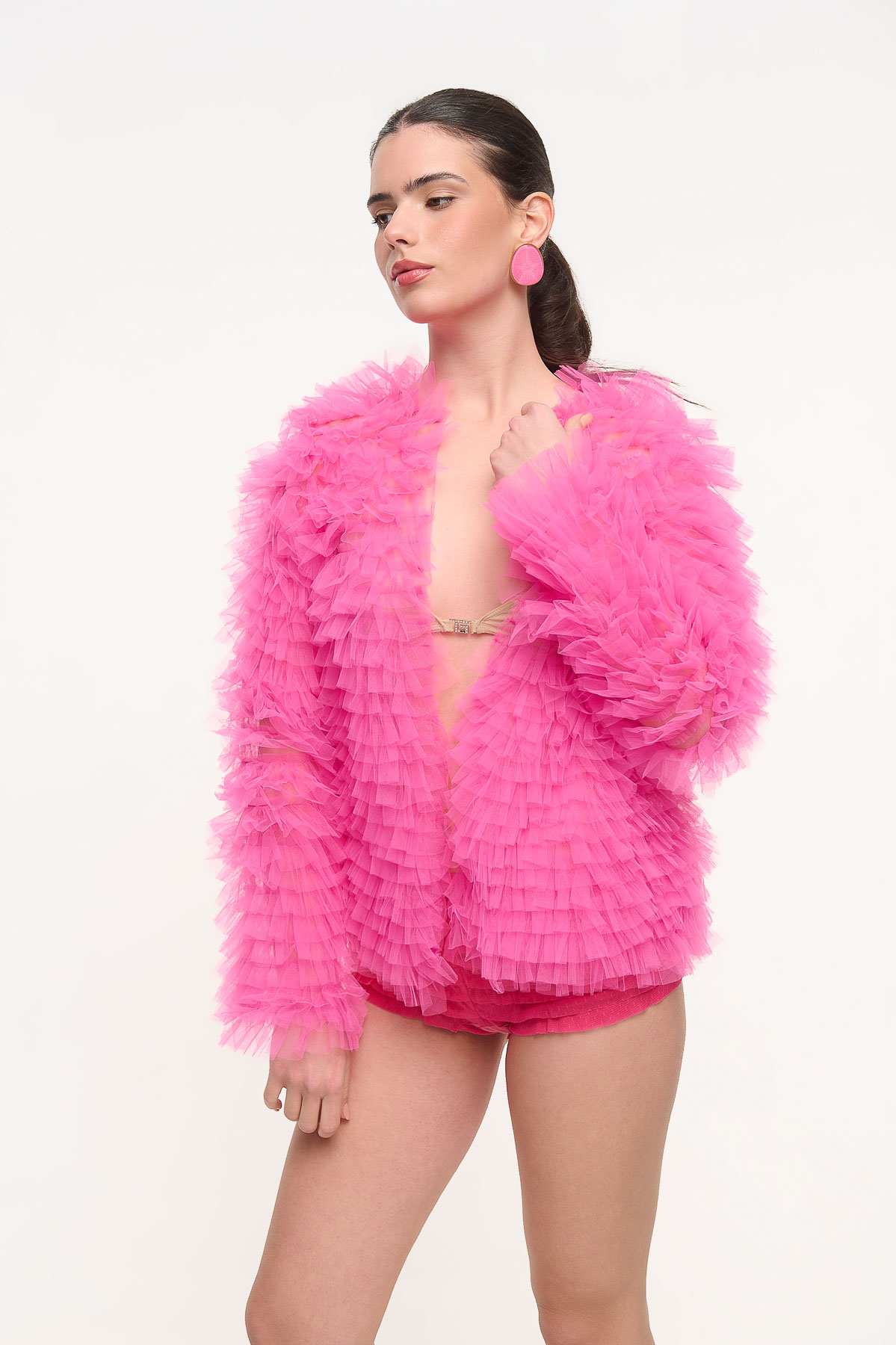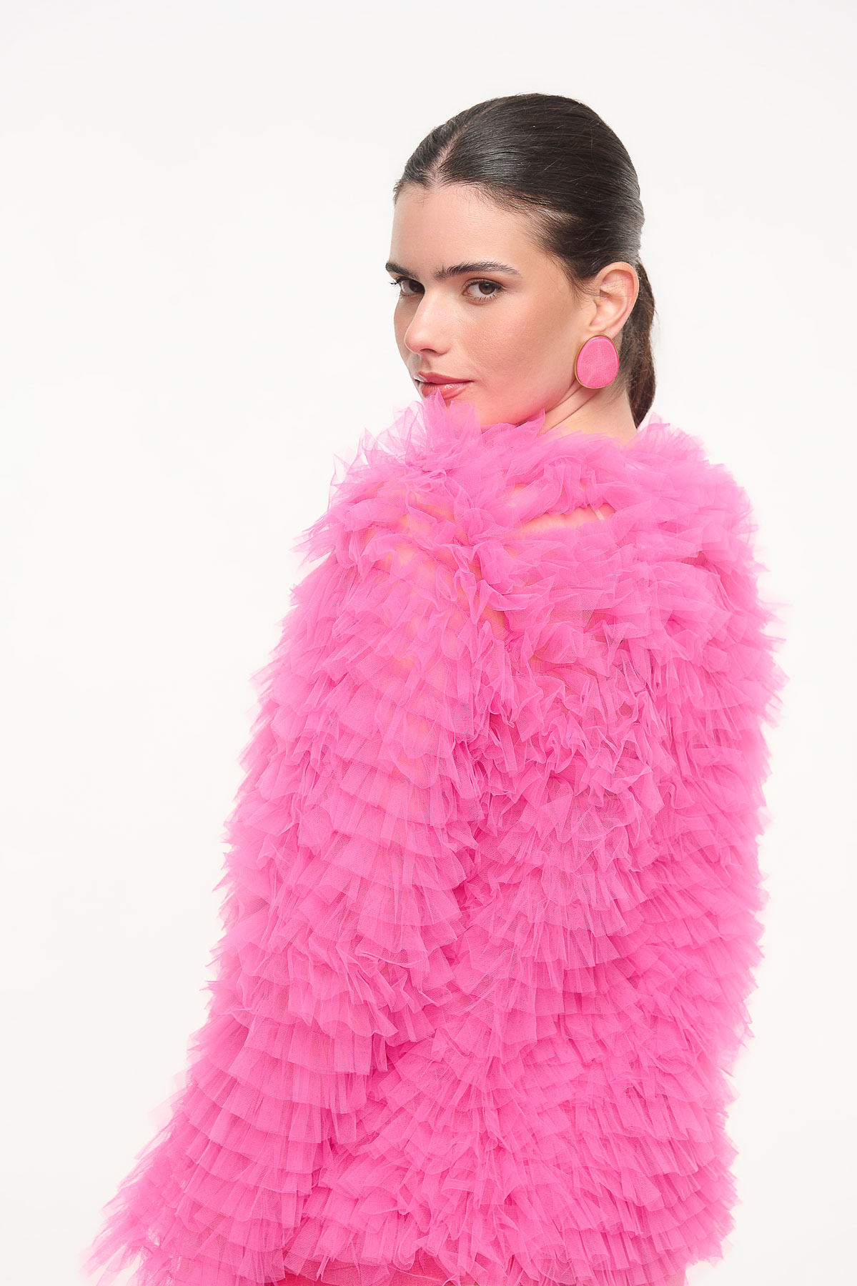 Εντυπωσιακή ζακέτα από τούλι με πλούσια βολάν που δημιουργούν μοναδική υφή και όγκο. Το ιδιαίτερο design της χαρίζει δυναμικό χαρακτήρα και μετατρέπει κάθε εμφάνιση σε fashion statement, είτε φορεθεί πάνω από ένα minimal σύνολο είτε σε πιο βραδινό styling.